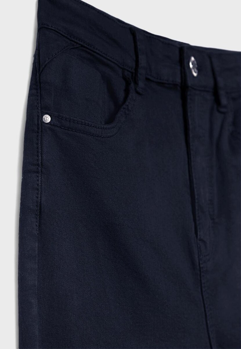 Tettsittende bukser med høy midje og fem lommer. Gylf med glidelås og knappelukking. Tilgjengelig i flere farger.