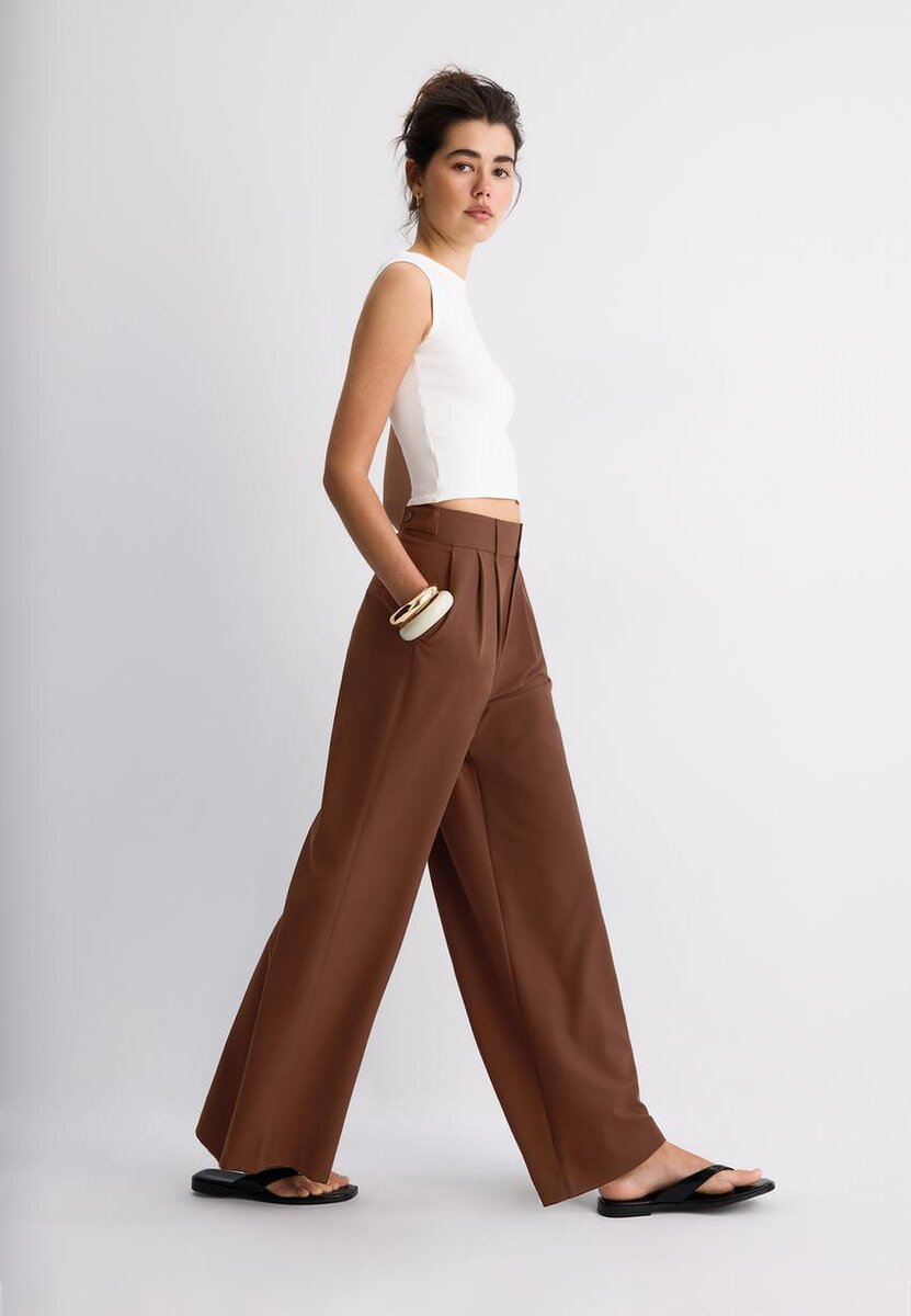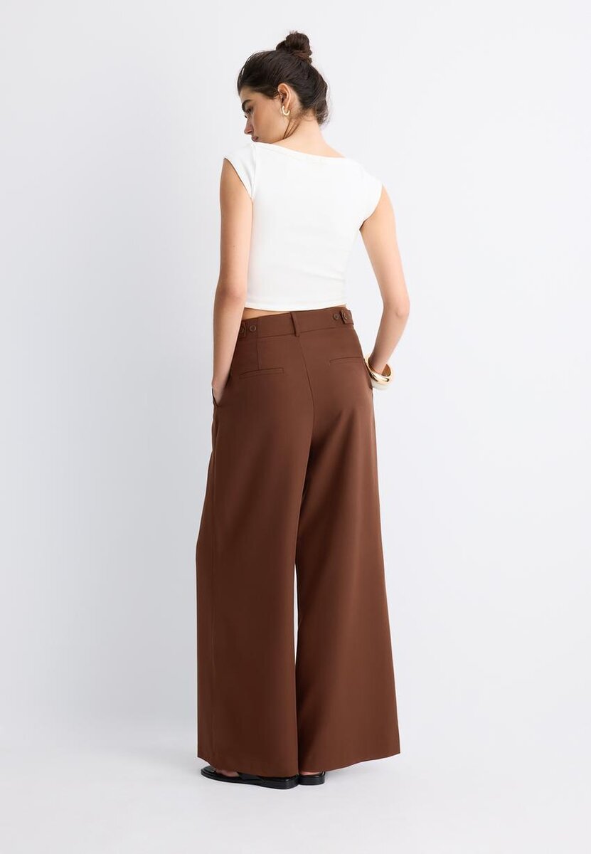 Løse bukser med middels høy midje og justerbar linning med knapper. Med lommer foran, falske baklommer, innsnit foran og metallkrok, knapp på innsiden og glidelås foran.