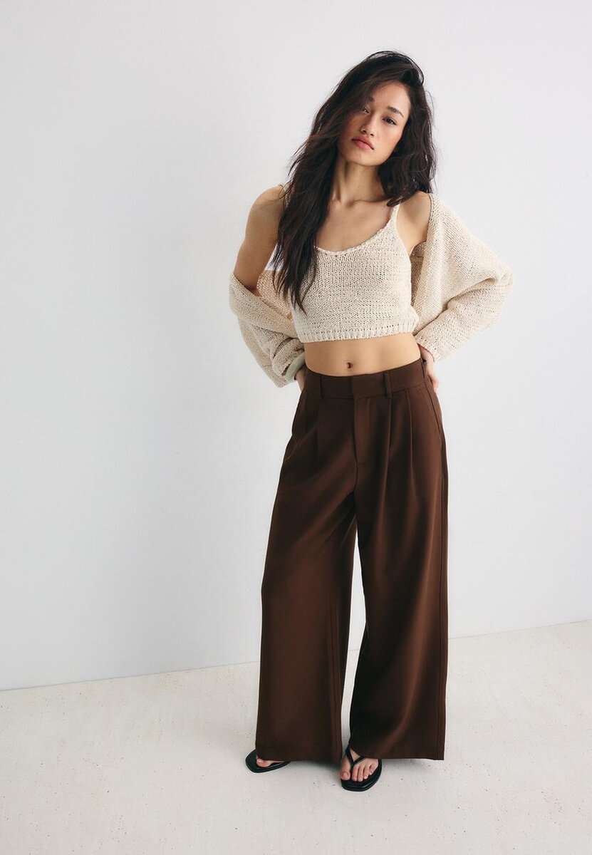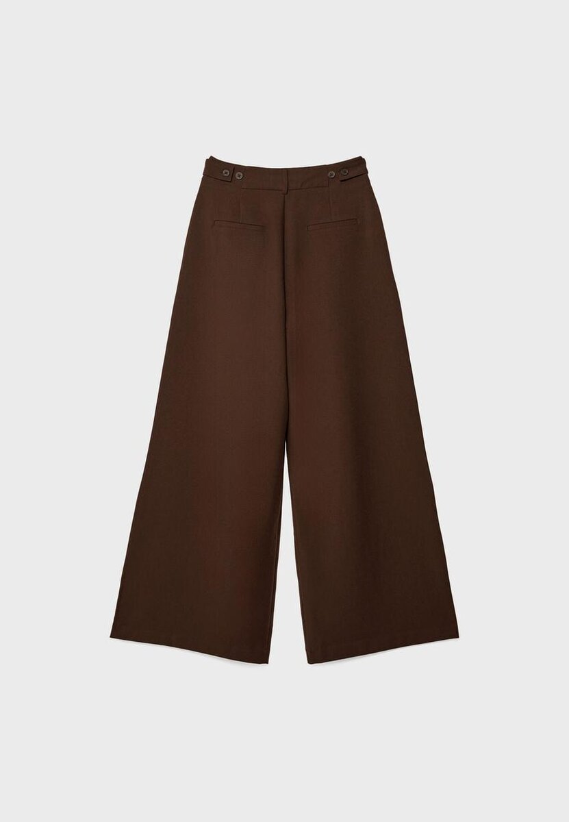 Løse bukser med middels høy midje og justerbar linning med knapper. Med lommer foran, falske baklommer, innsnit foran og metallkrok, knapp på innsiden og glidelås foran.