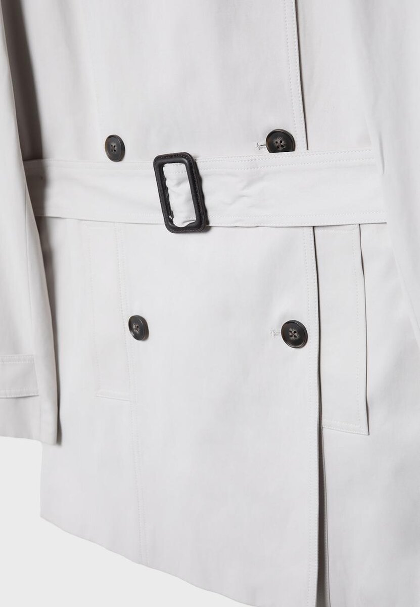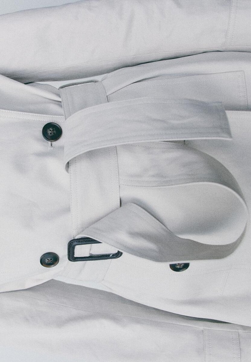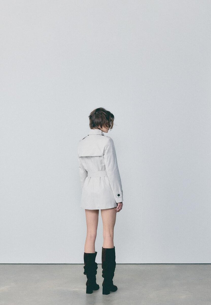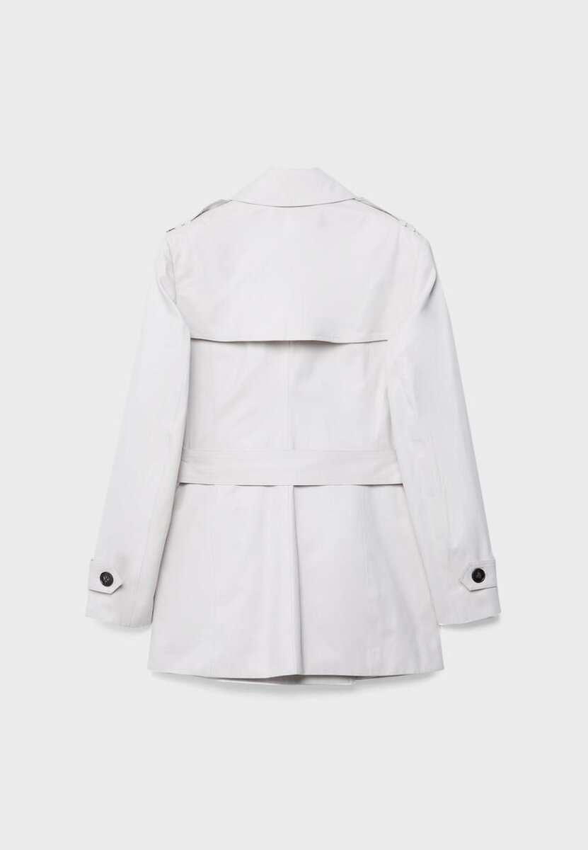 Kort trenchcoat med reverskrage og lange ermer med knappelukking. Med lommer foran og dobbel knappelukking foran med matchende stoffbelte. Tilgjengelig i flere farger.