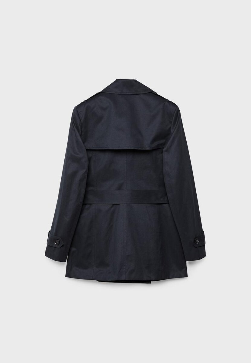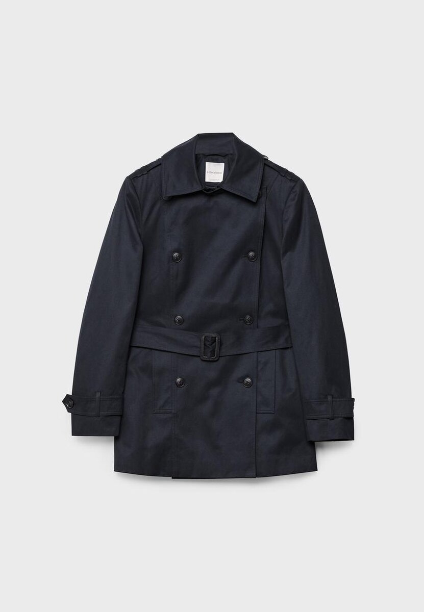 Kort trenchcoat med reverskrage og lange ermer med knappelukking. Med lommer foran, dobbel knappelukking og matchende stoffbelte.