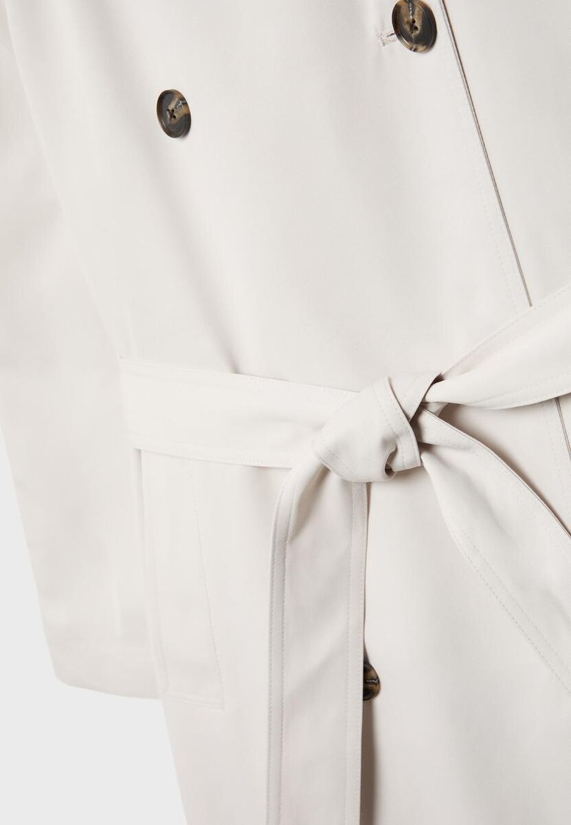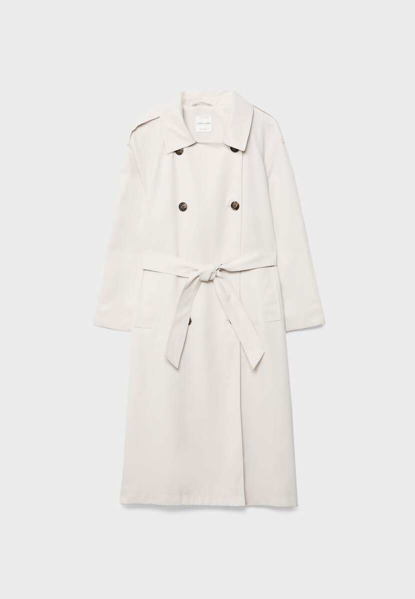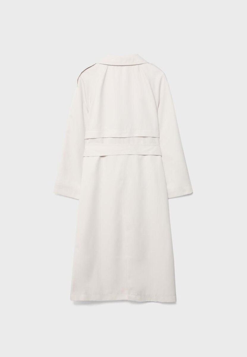 Lang, flytende trenchcoat. Med reverskrage, lange ermer og sidelommer. Dobbeltspent knappelukking og et belte i samme stoff. Tilgjengelig i flere farger.