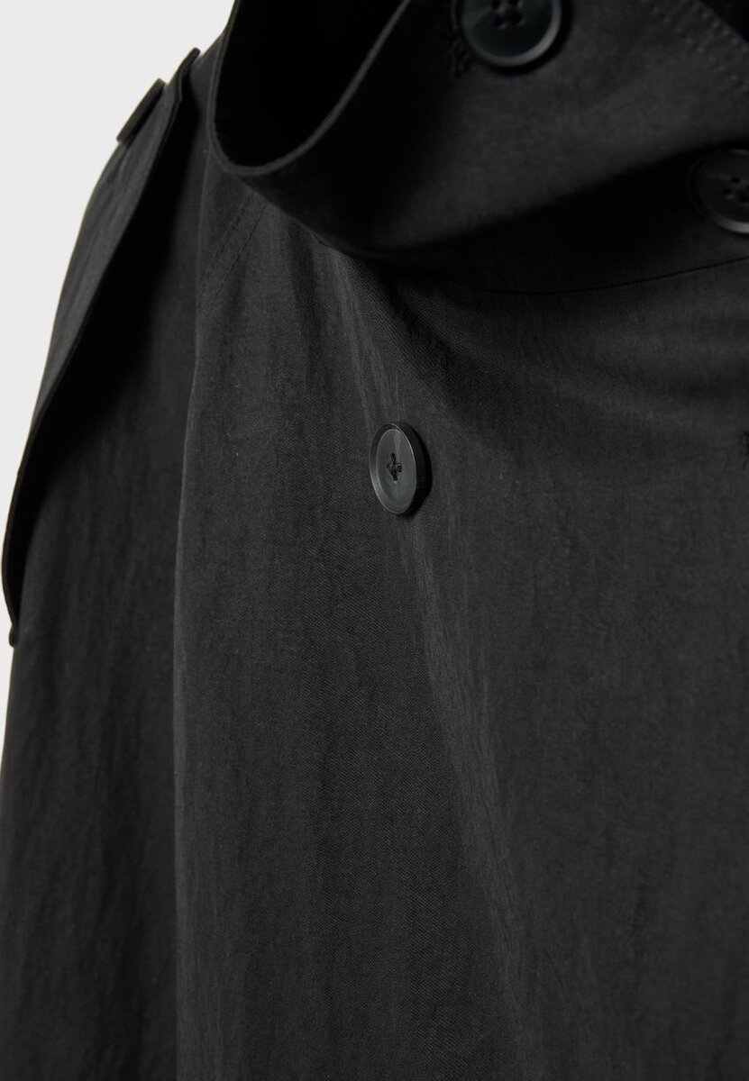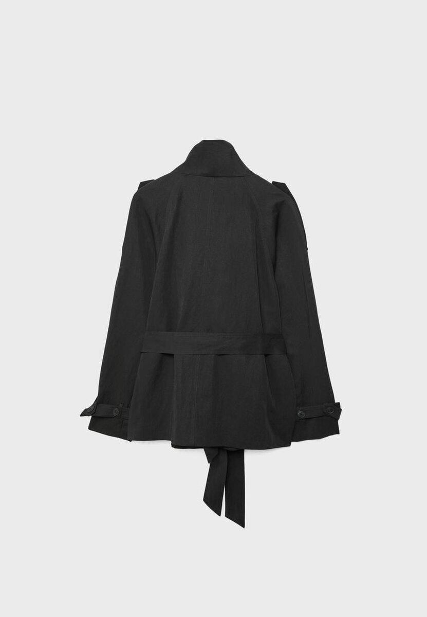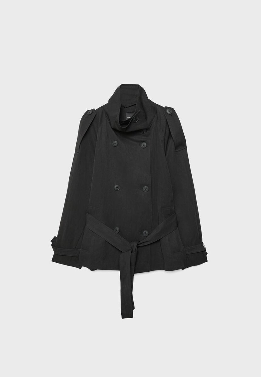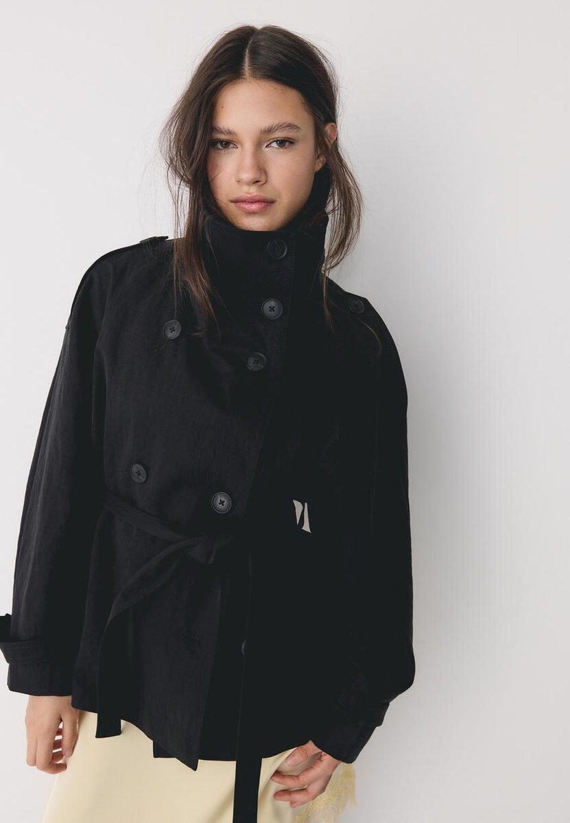 Kort trenchcoat med høy hals og lange ermer med stropp- og knappdetaljer. Sidelommer. Dobbeltspent lukking foran med knapper og matchende belte. Tilgjengelig i flere farger.