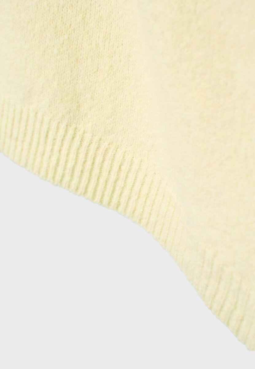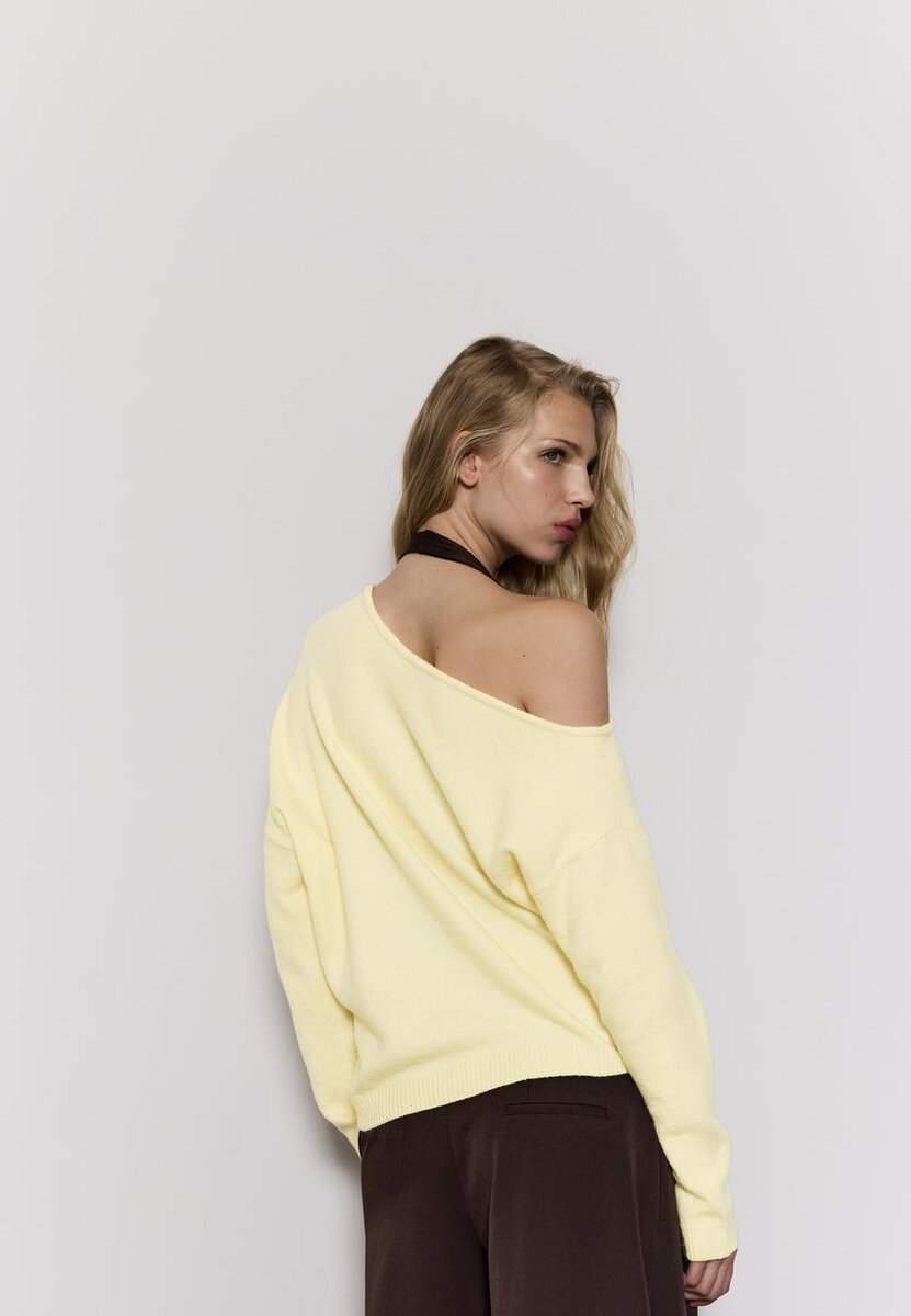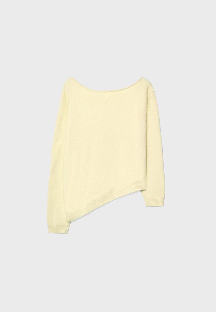 Strikket genser med båthals og lange ermer. Asymmetrisk kant. Ribbestrikkede kanter. Tilgjengelig i flere farger.