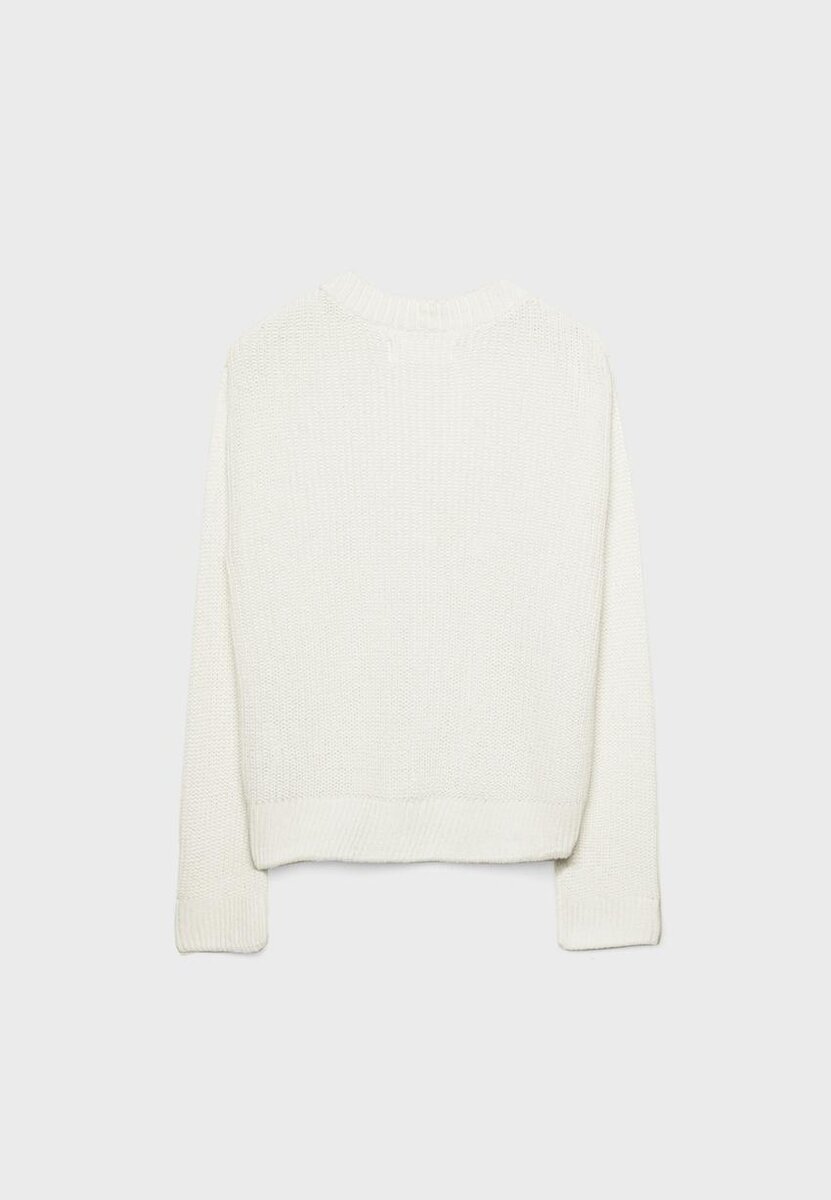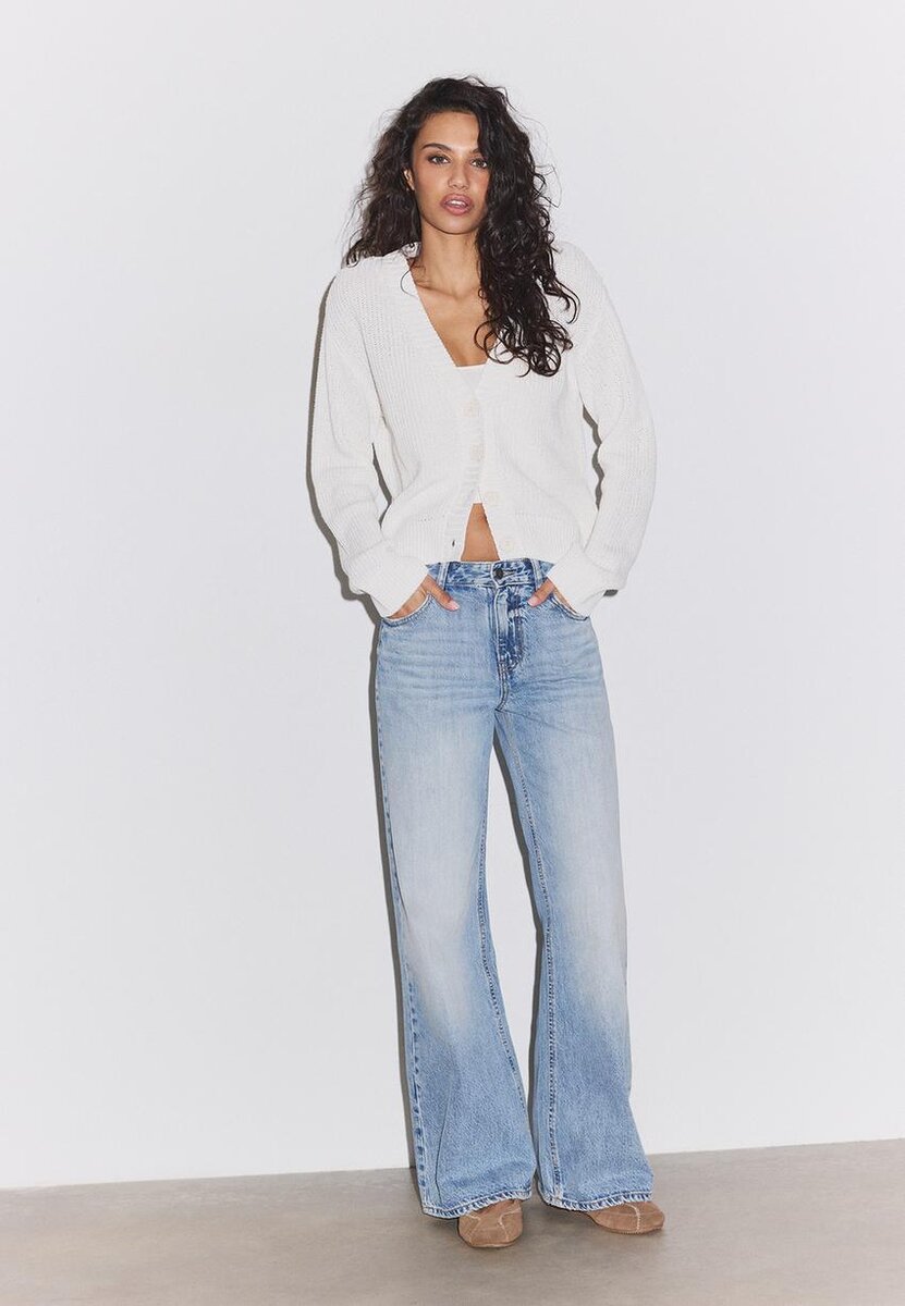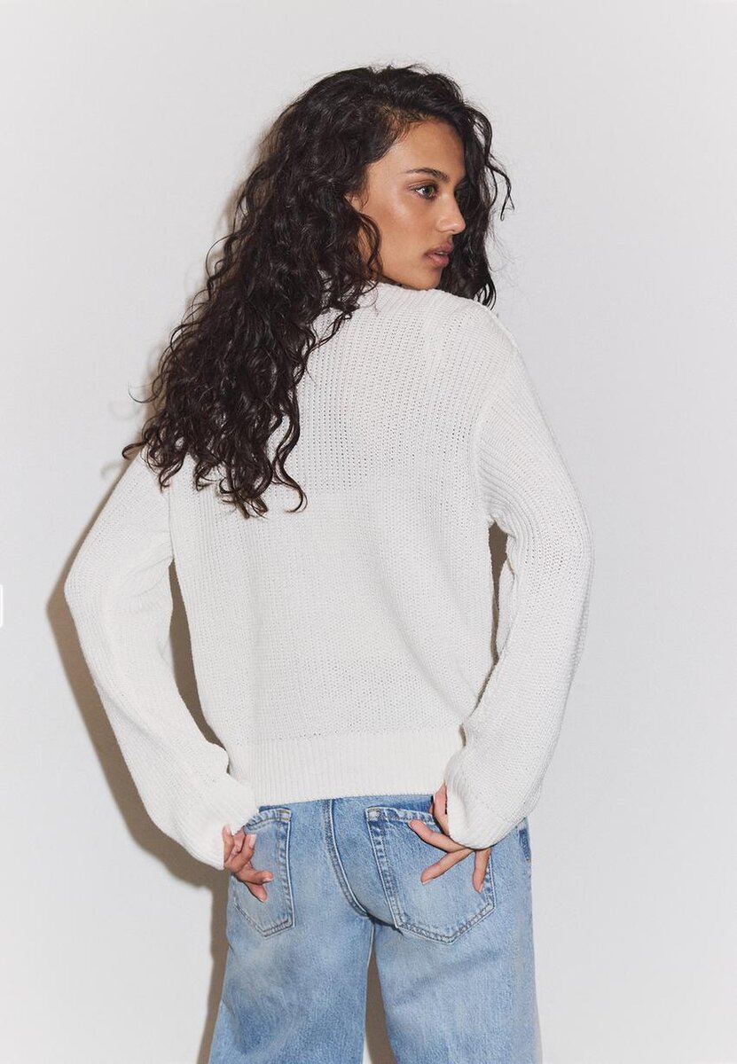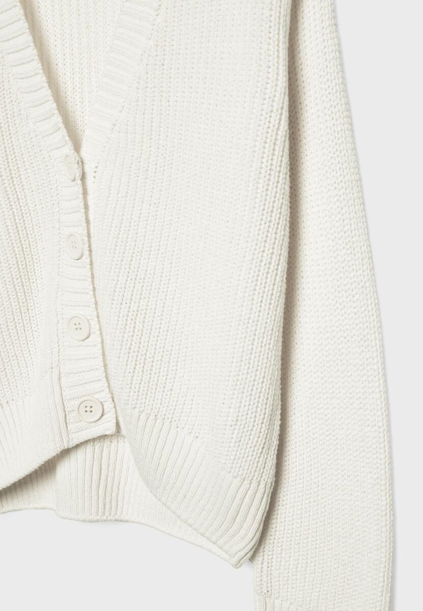 Strikkegenser med V-hals, lange ermer, ribbestrikkede kanter og matchende knappestolpe foran. Tilgjengelig i flere farger.