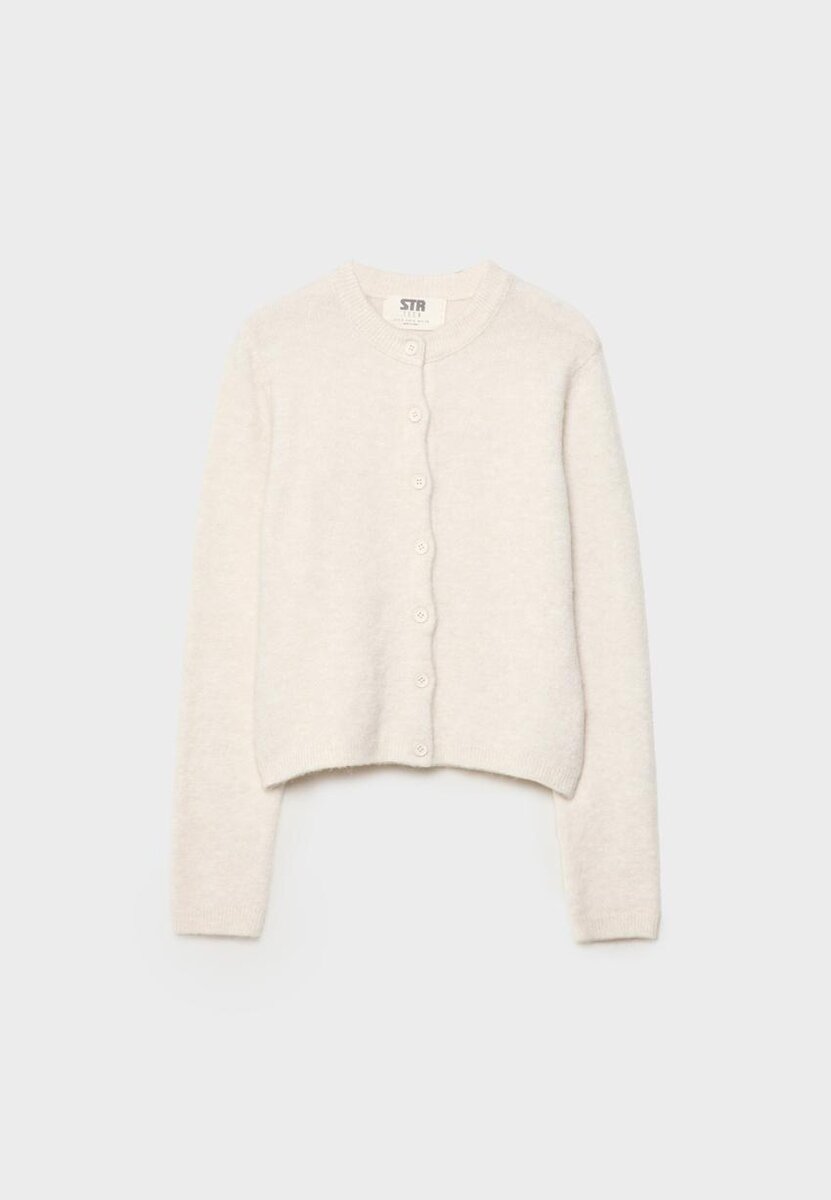 Strikket jakke med rund hals og lange ermer. Knapper foran. Tilgjengelig i flere farger.
