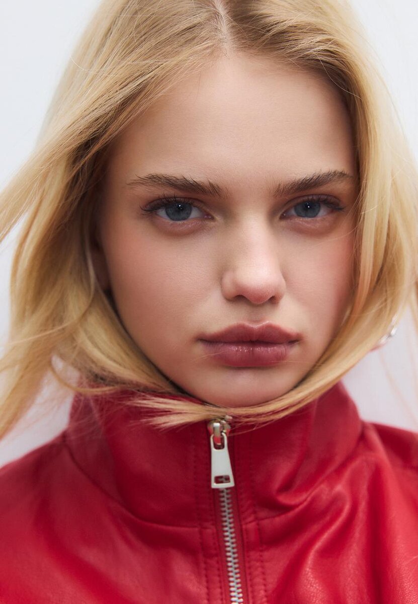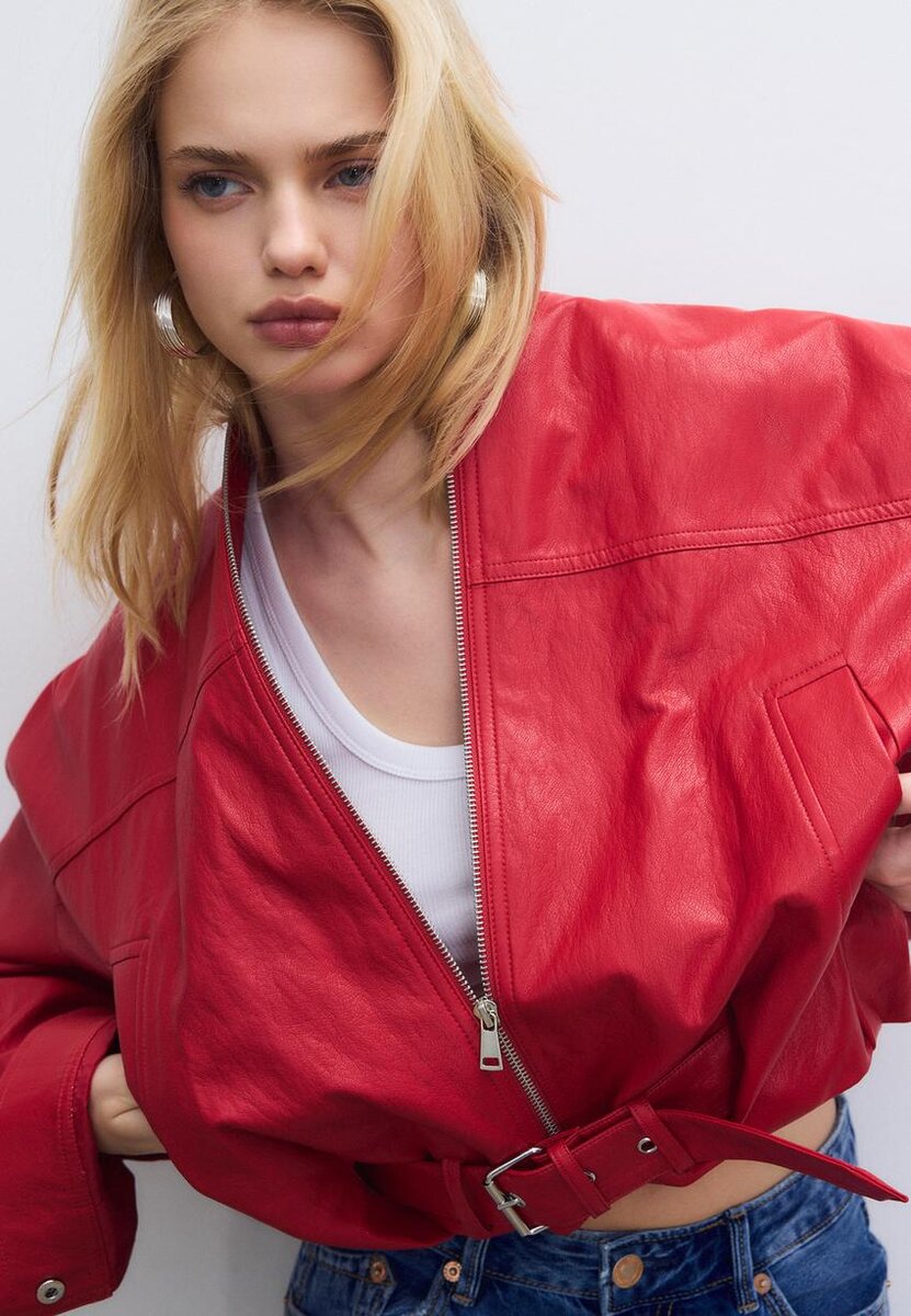 Ballongjakke laget av stoff i skinnimitasjon. Høy hals og lange ermer med mansjetter med trykknapper. Lommer med kant foran. Glidelås foran. Nederst med beltefestedetaljer.
