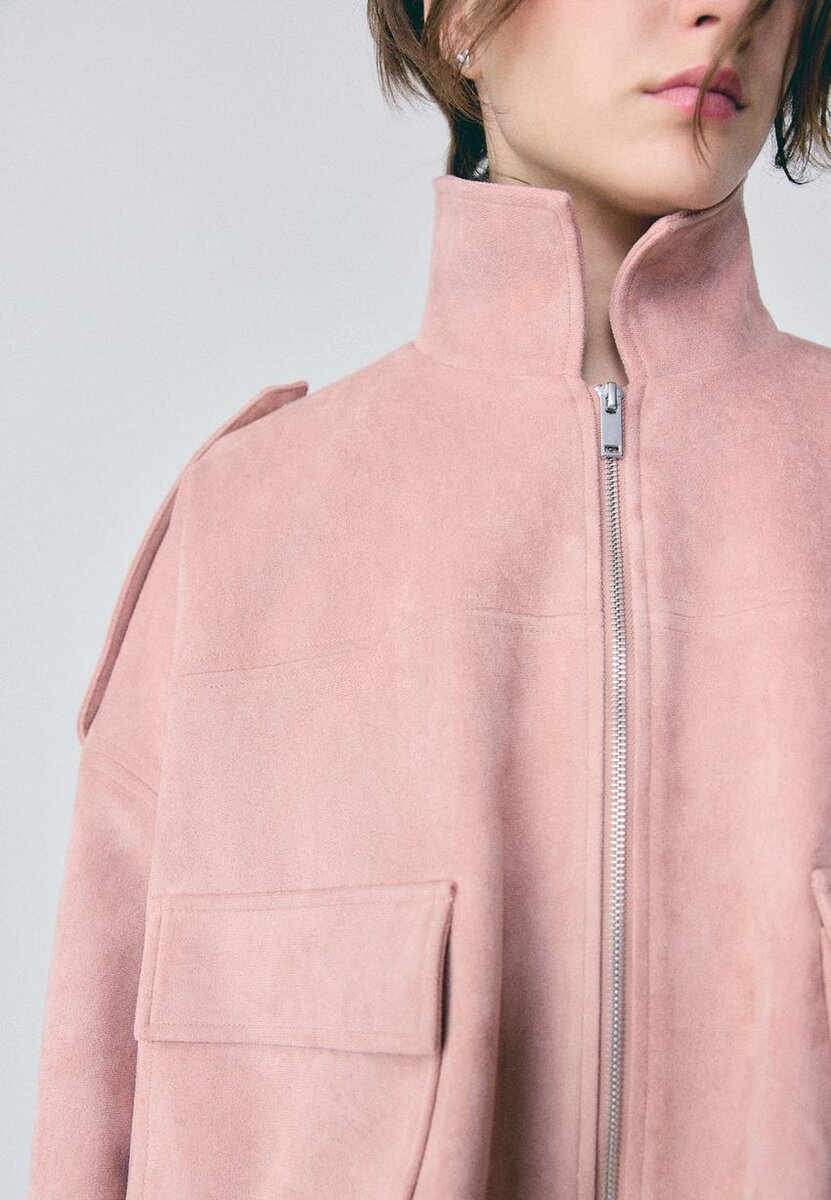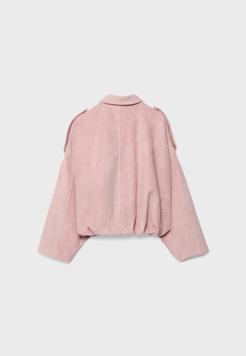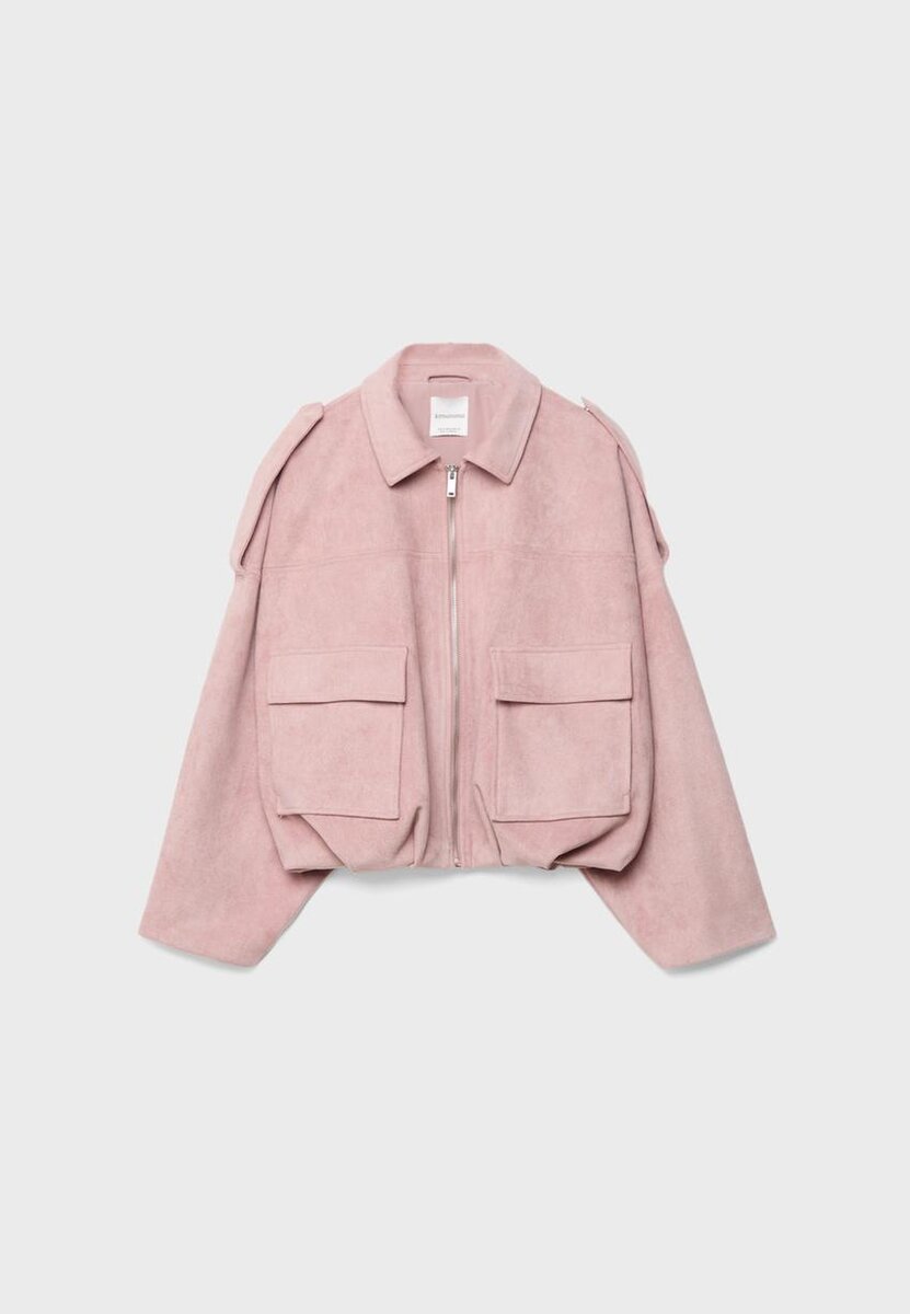 Jakke laget av imitert semsket skinn. Bomber-stil med reverskrage. Lange ermer og elastisk kant nederst. Påsydde lommer foran. Glidelås foran. Detaljer på skuldrene. Tilgjengelig i ulike farger.