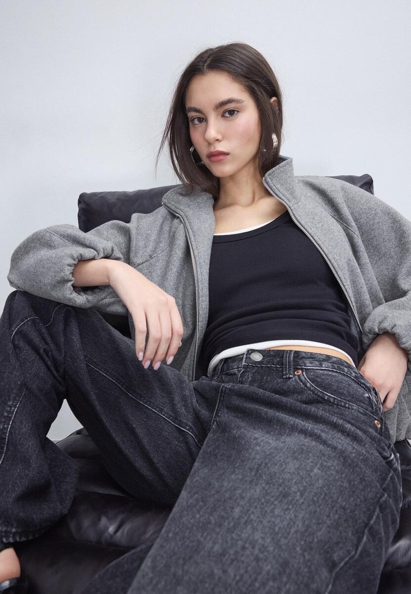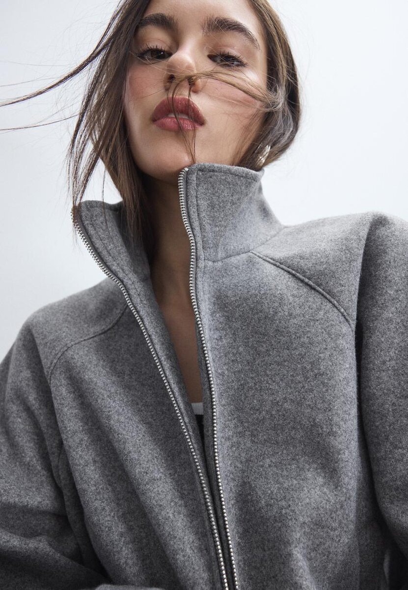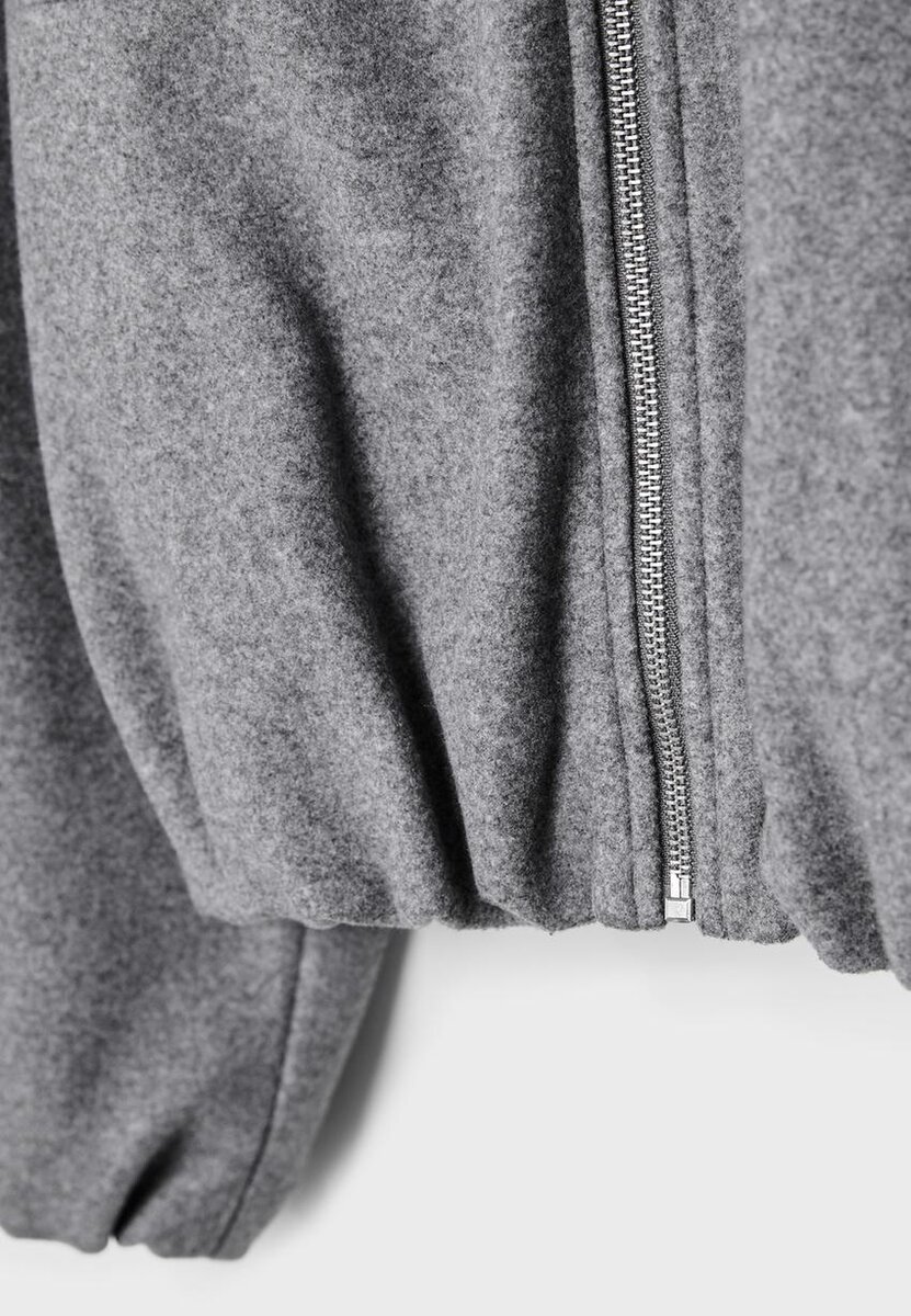 Bomberjakke med høy hals. Lange ermer og elastisk ballongkant nederst. Lommer med kant foran. Glidelås foran.