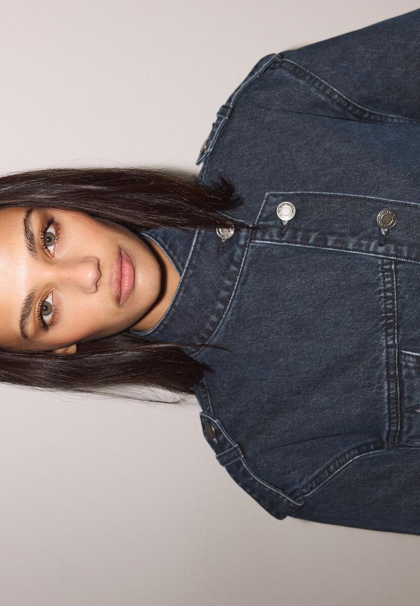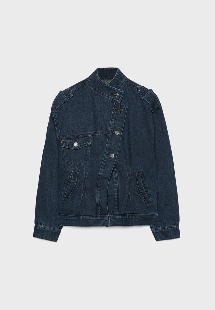 Jeansjakke med stående krage, lange ermer og mansjetter med knapper. Med paspolerte lommer foran og påsydde lommer med klaff og knapper på brystet. Krysset metallknappfeste foran. Knappet flikdetalj på skuldrene.