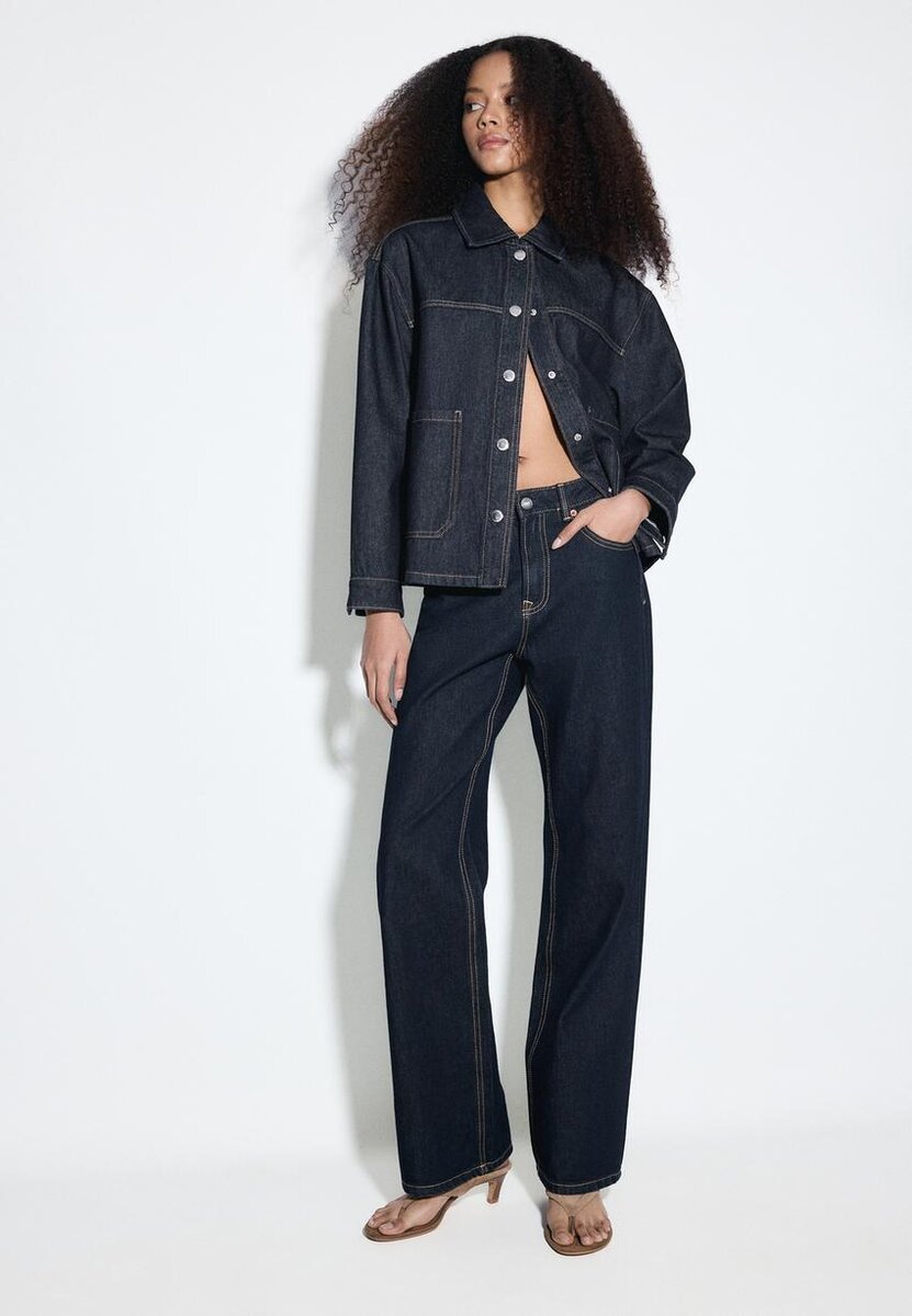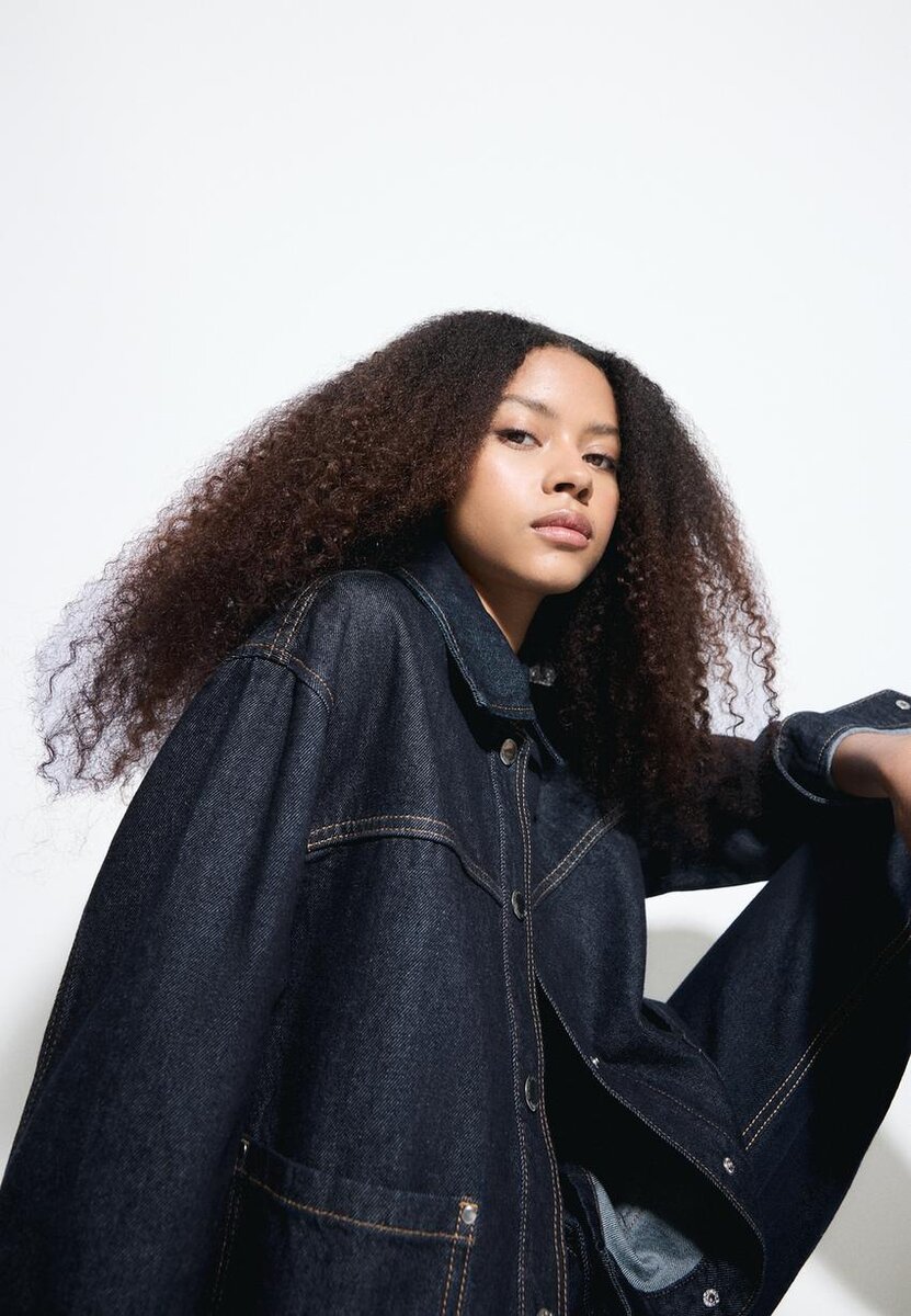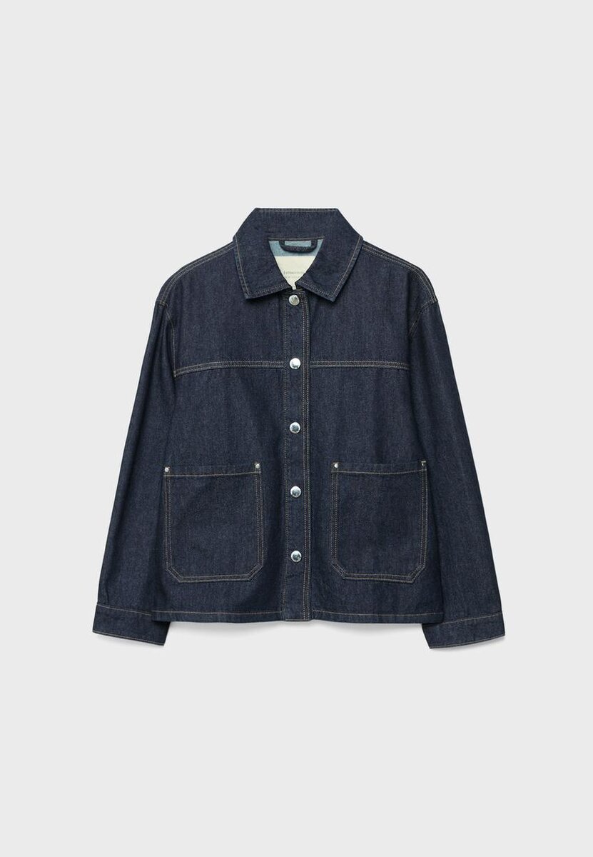 Denimjakke med krage, lange ermer og mansjetter med knapper. Påsydde lommer foran. Lukking med metallknapper foran.
