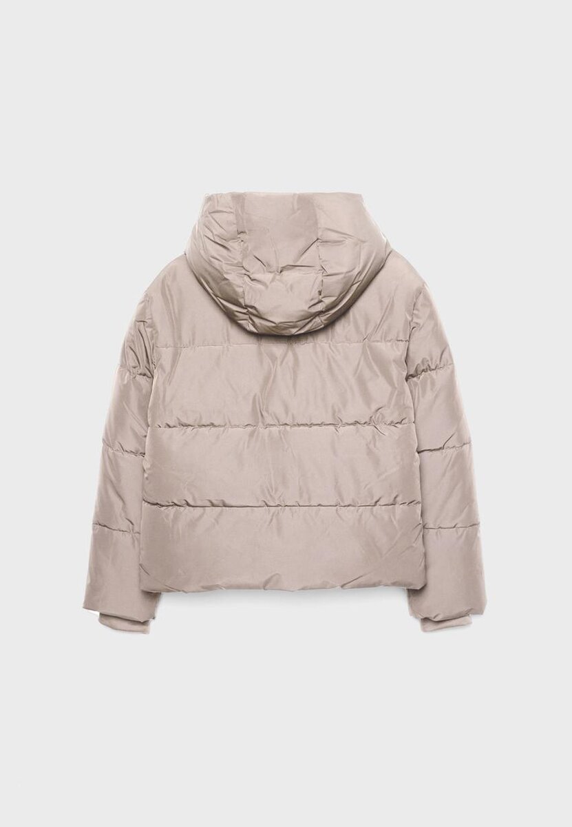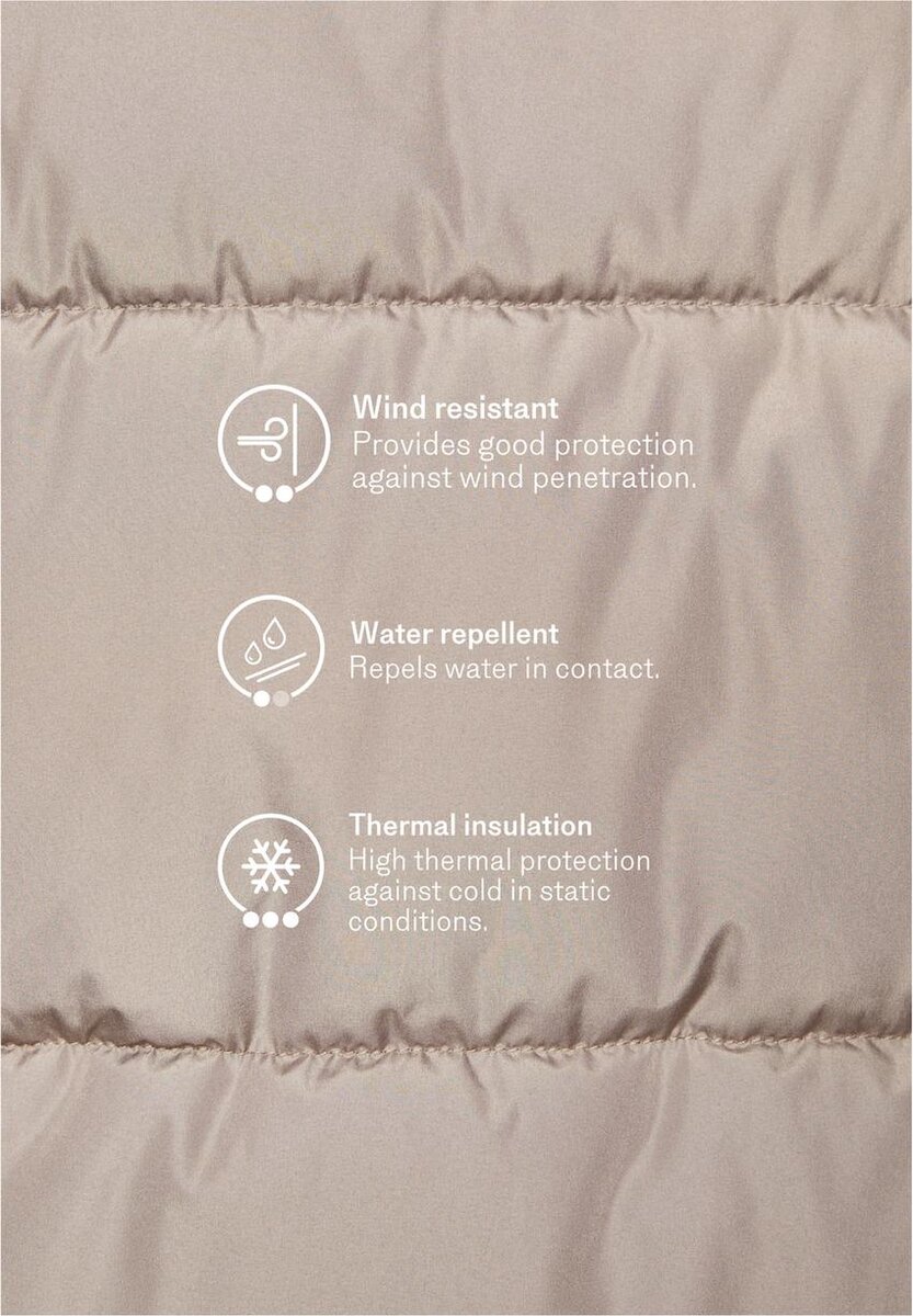 Dunjakke med høy hals, hette og lange ermer med mansjetter. Med sidelommer med lukking, justerbar nederkant med elastisk snøring og stopper samt glidelås foran. Tilgjengelig i flere farger.
