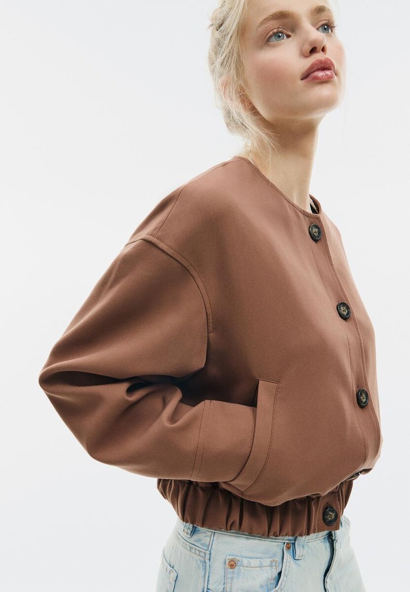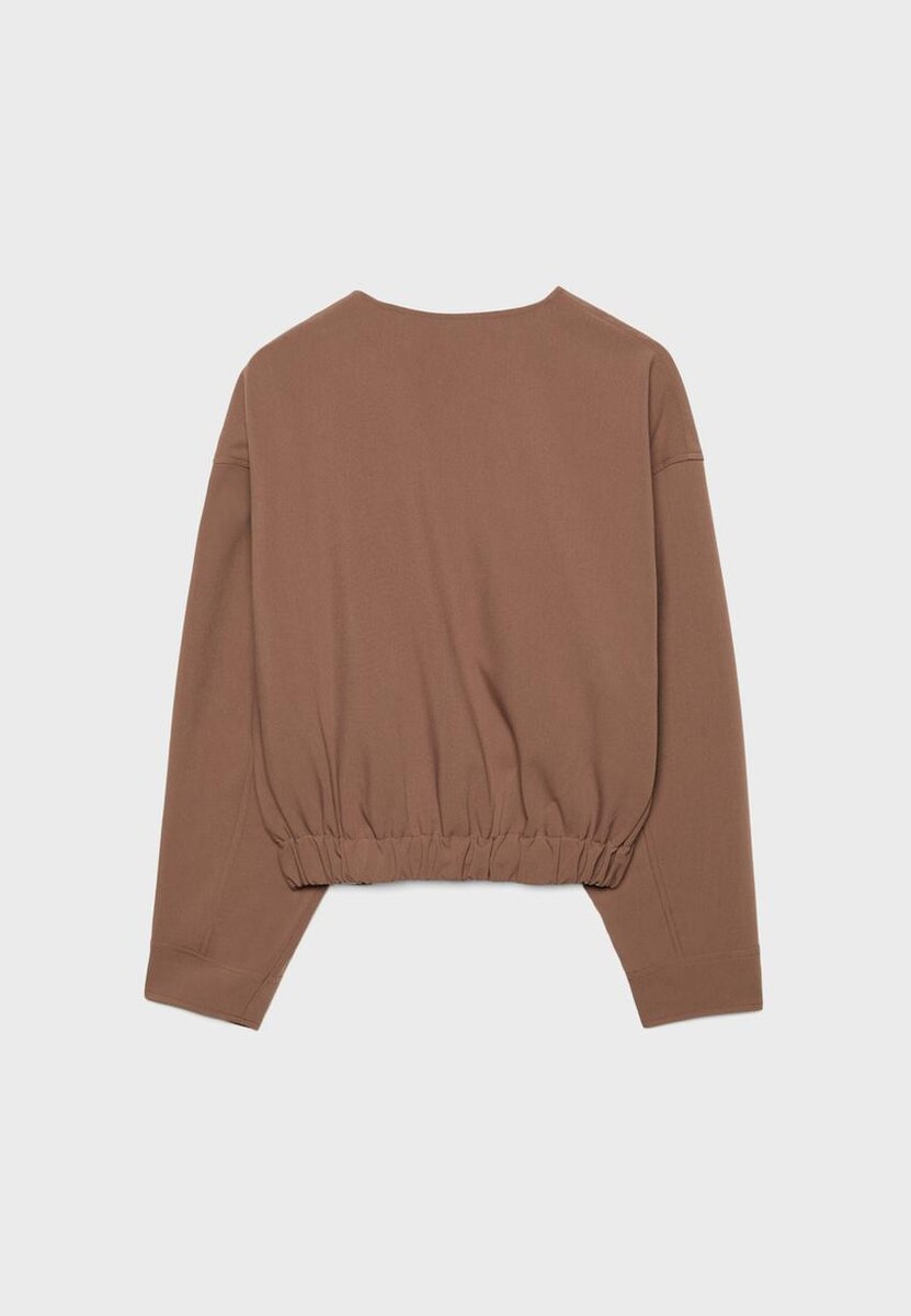 Jakke med rund hals og lange ermer. Med lommer foran, elastisk kant nederst og knappestenging foran.