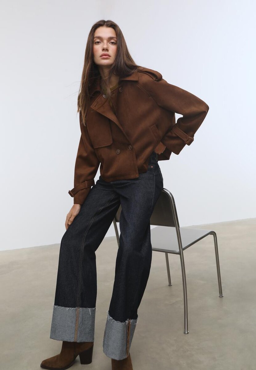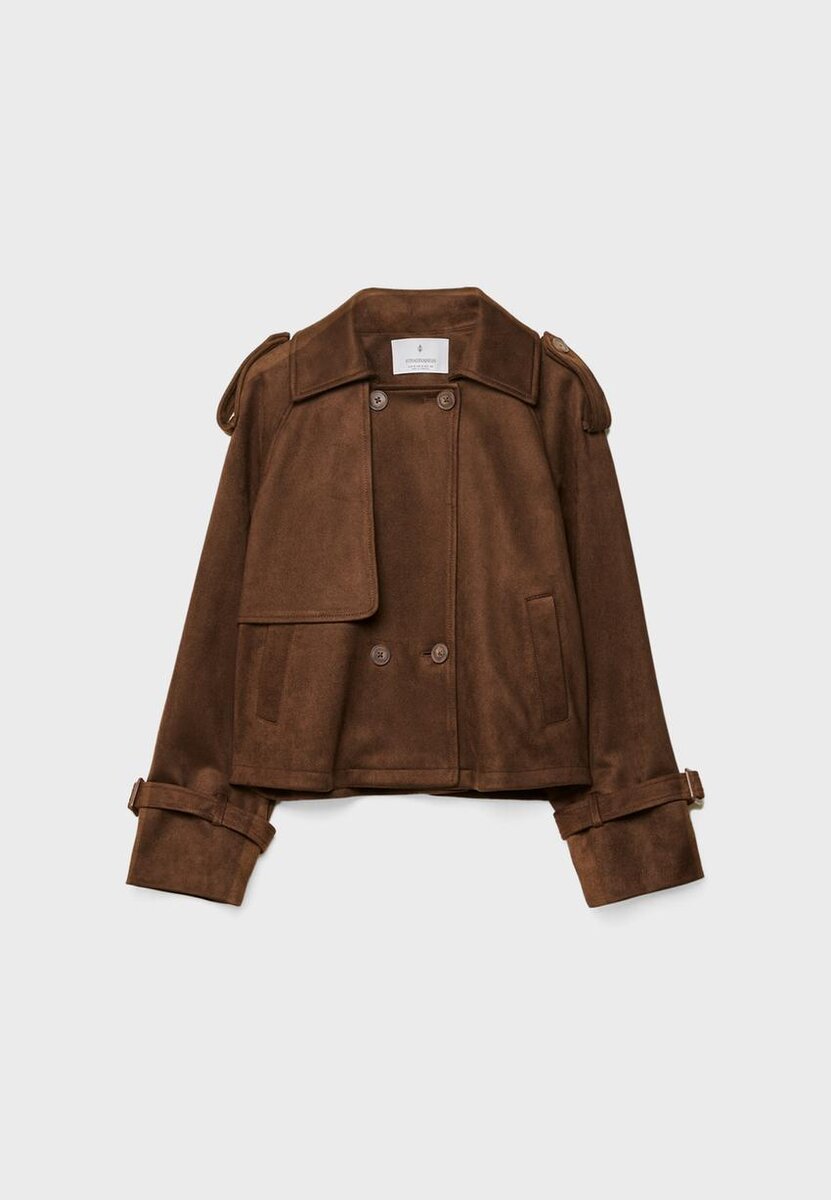 Kort, løstsittende trenchcoat med reverskrage og lange ermer med stropper. Med sidelommer, dobbeltspent knappestolpe foran og detaljer i imitert semsket skinn.