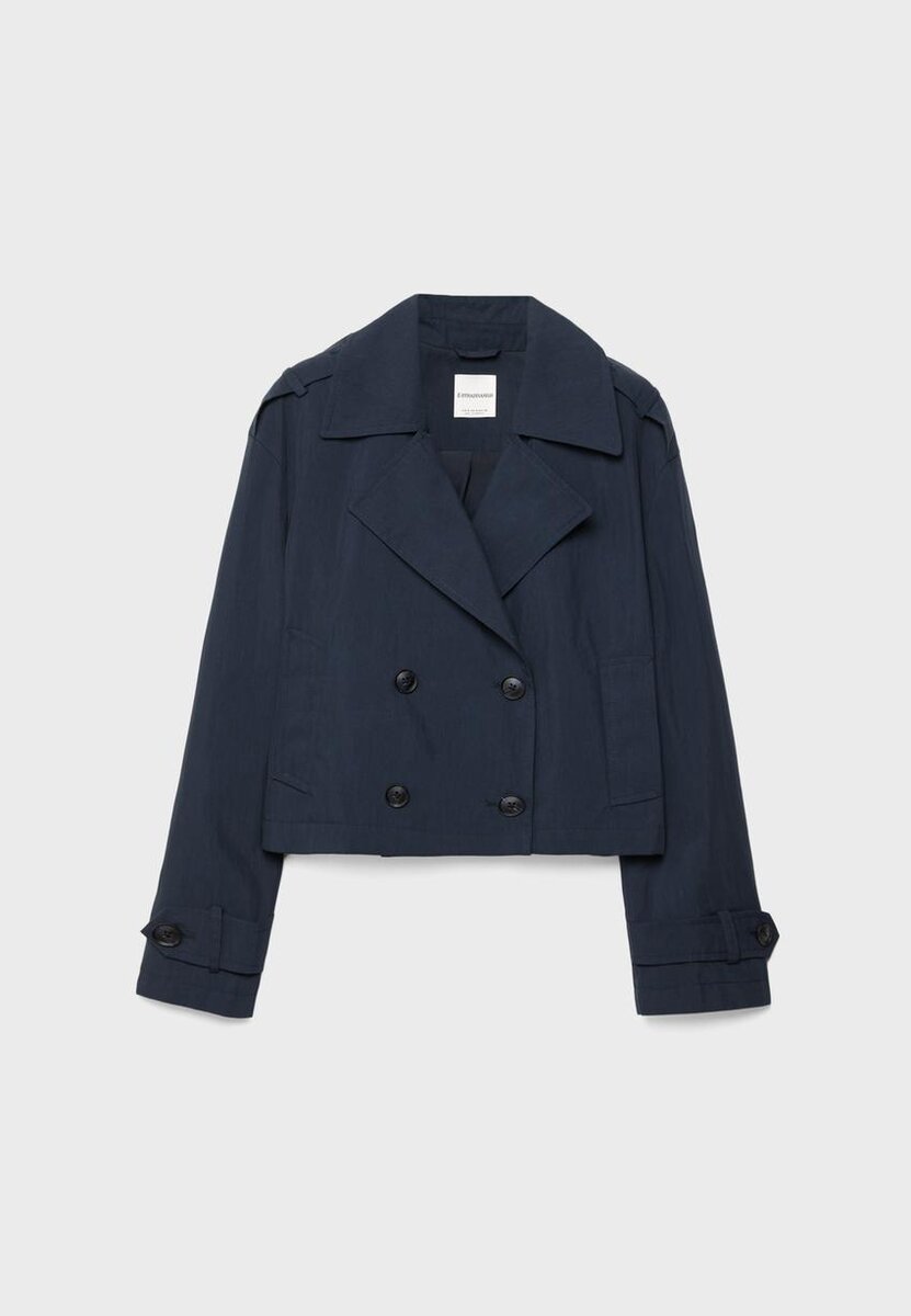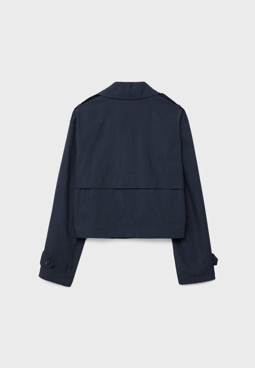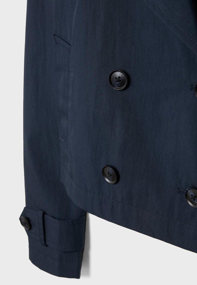Kort trenchcoat med reverskrage og lange ermer med stropper og knappestolpe. Sidelommer. Dobbeltradet knappestolpe foran. Tilgjengelig i ulike farger.