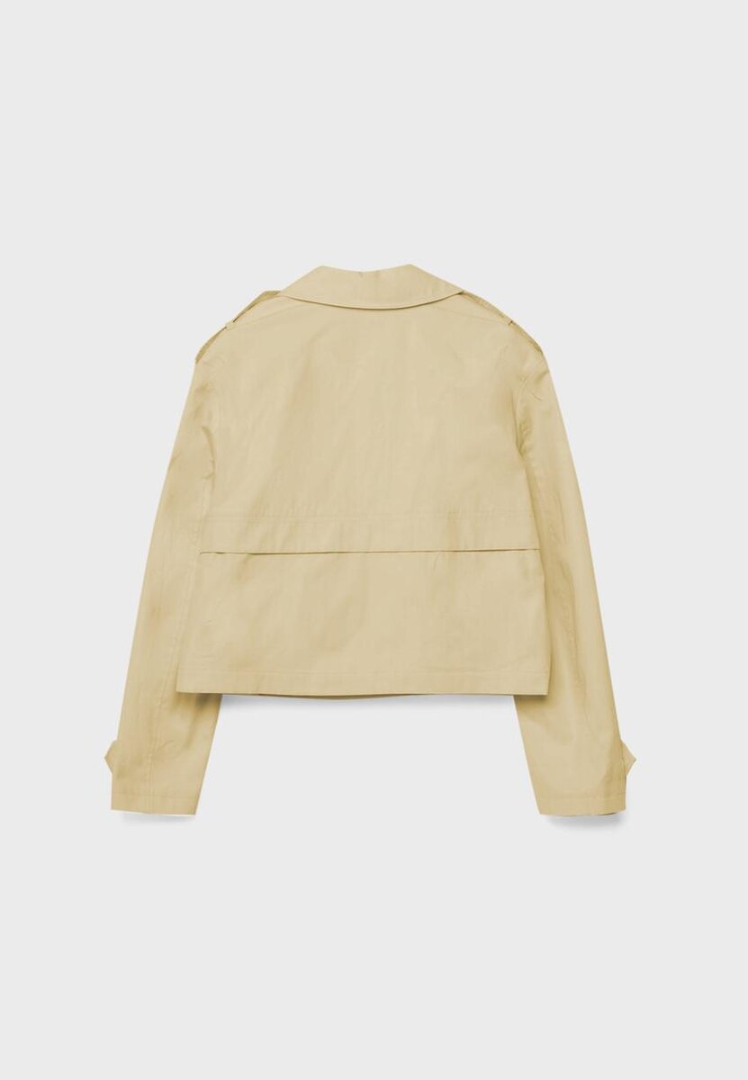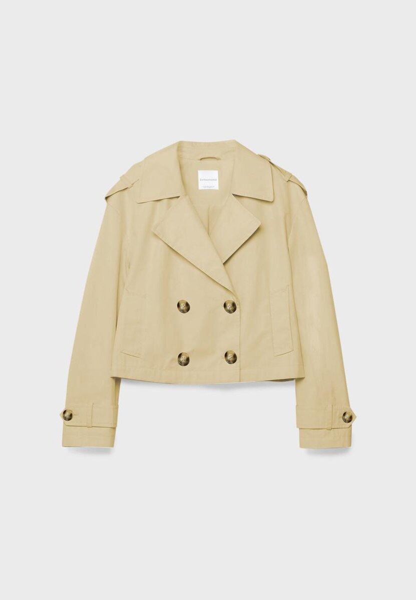 Kort trenchcoat med reverskrage og lange ermer med knappelukking. Sidelommer. Dobbeltradet knappestenging. Tilgjengelig i ulike farger.