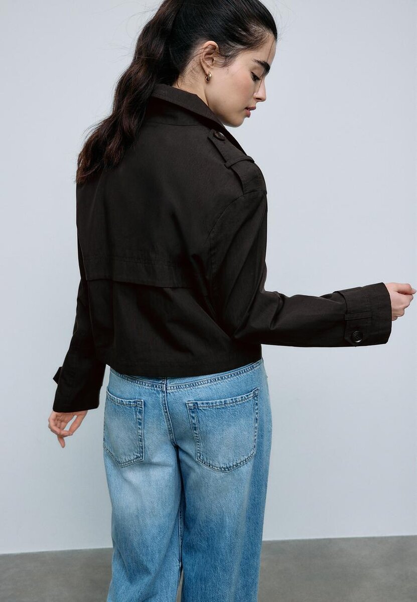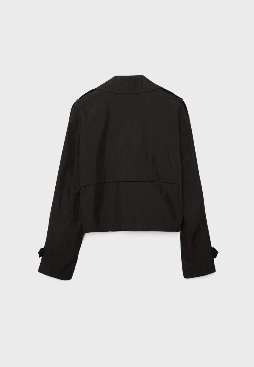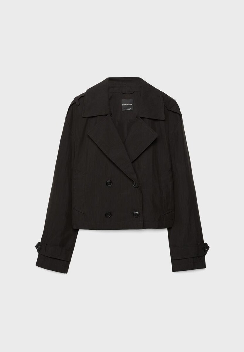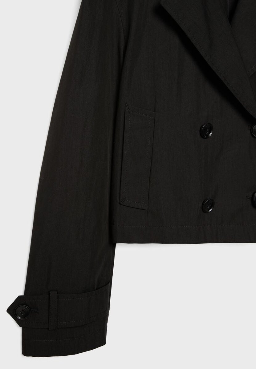 Kort trenchcoat med reverskrage og lange ermer med knappelukking. Sidelommer. Dobbeltradet knappestenging foran. Tilgjengelig i flere farger.