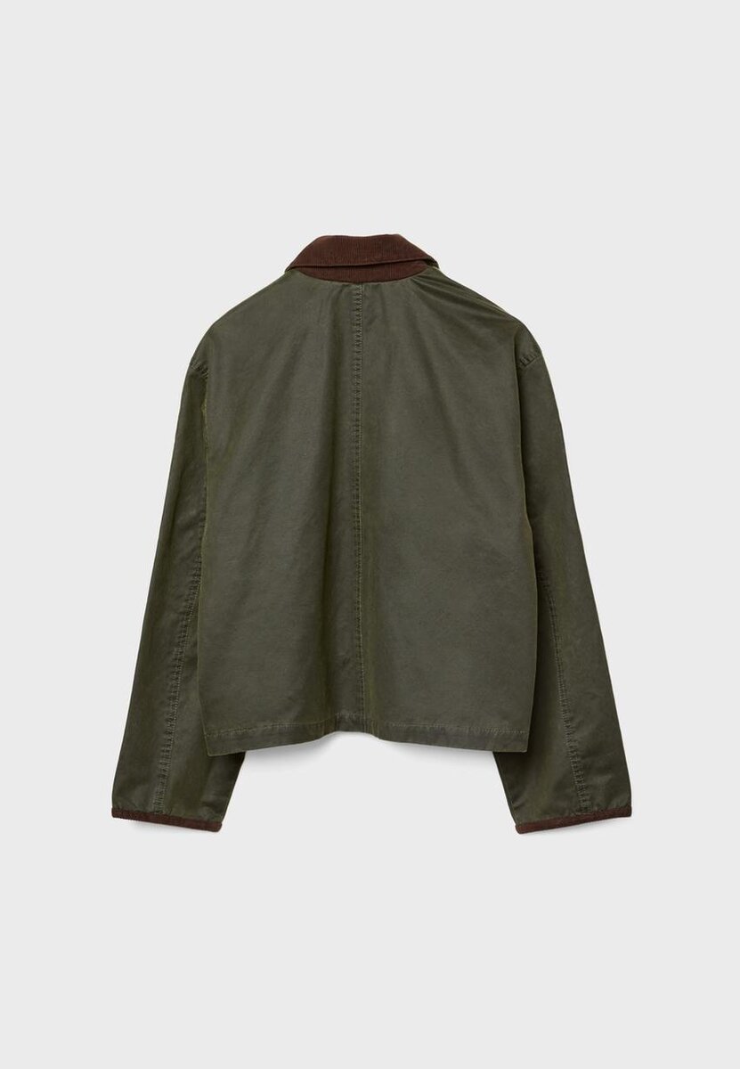 Kort voksjakke med krage og lange ermer. Med påsydde lommer med klaff foran, kontrastkanter og trykknapp- og skjult glidelåslukking foran.