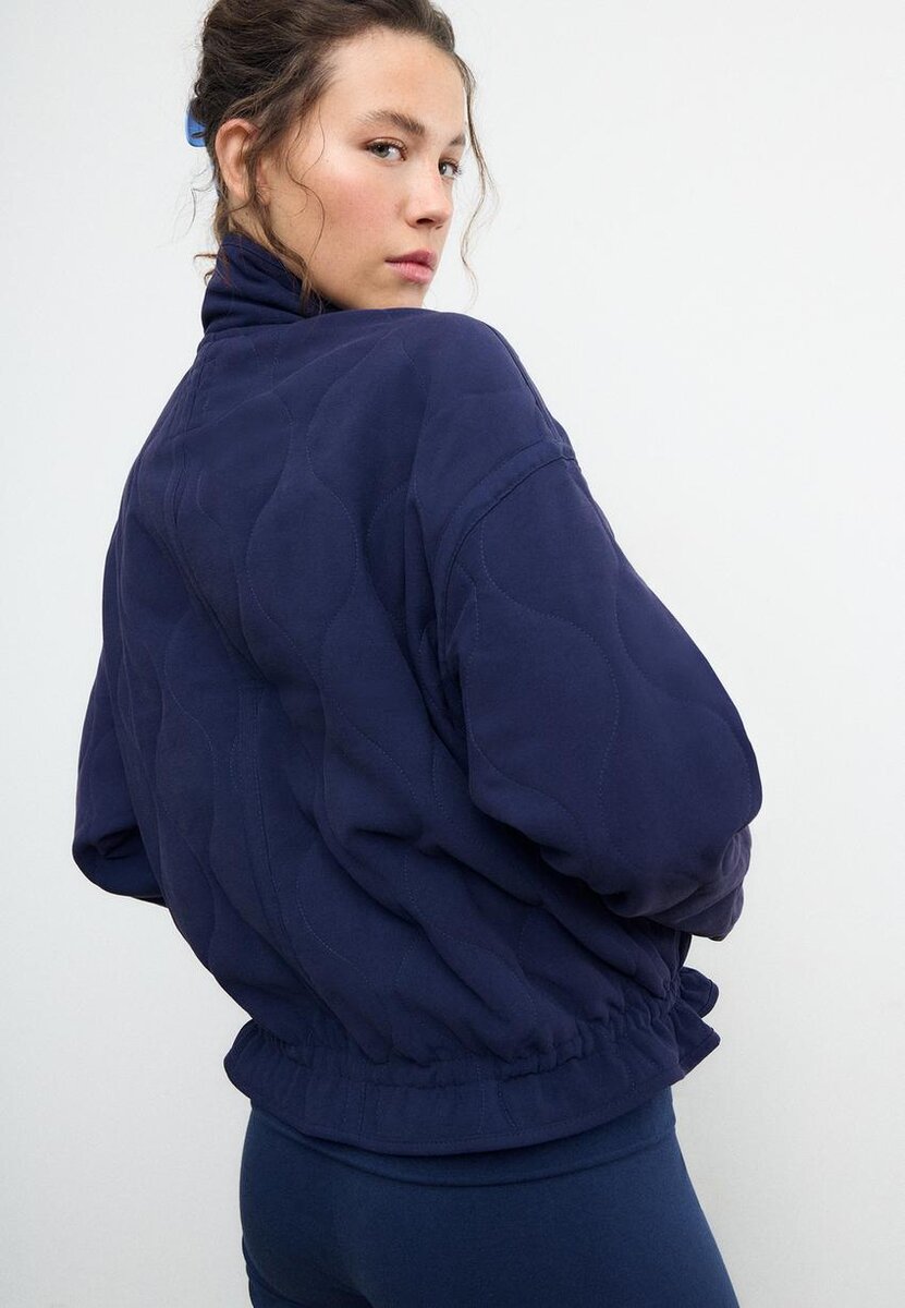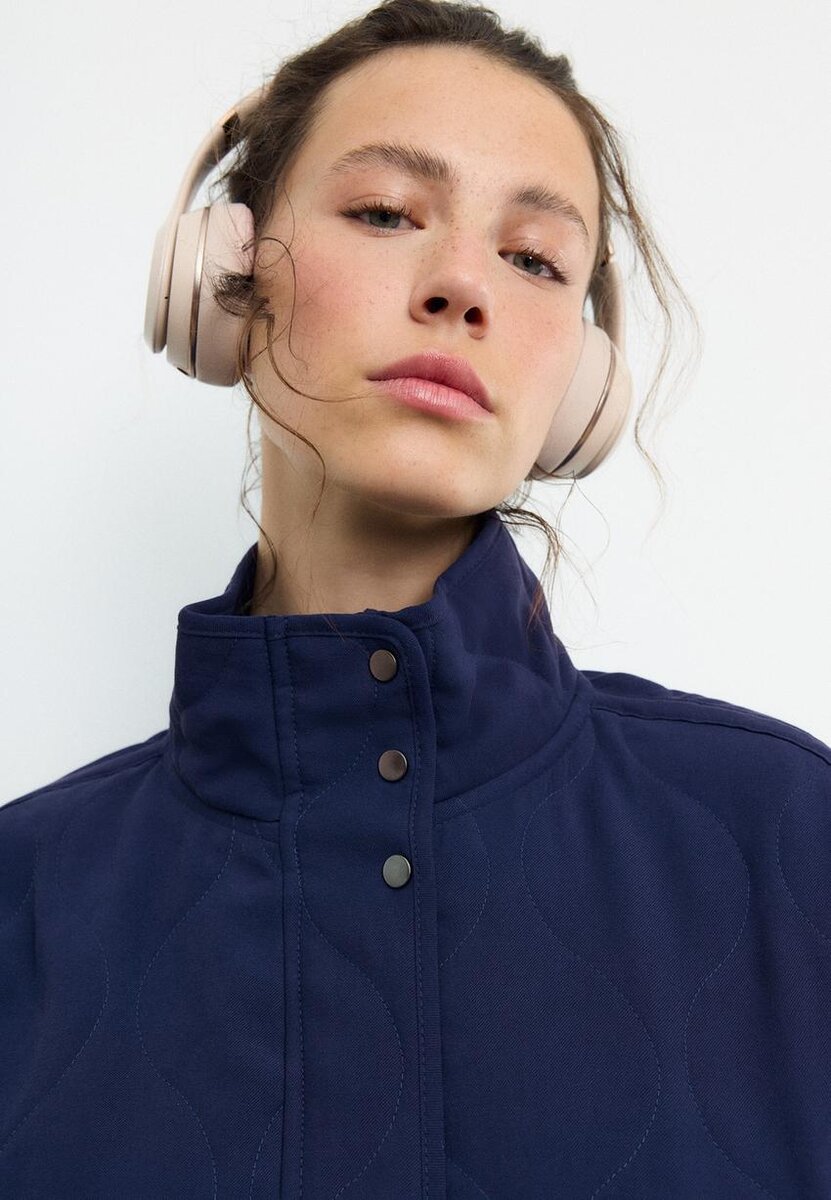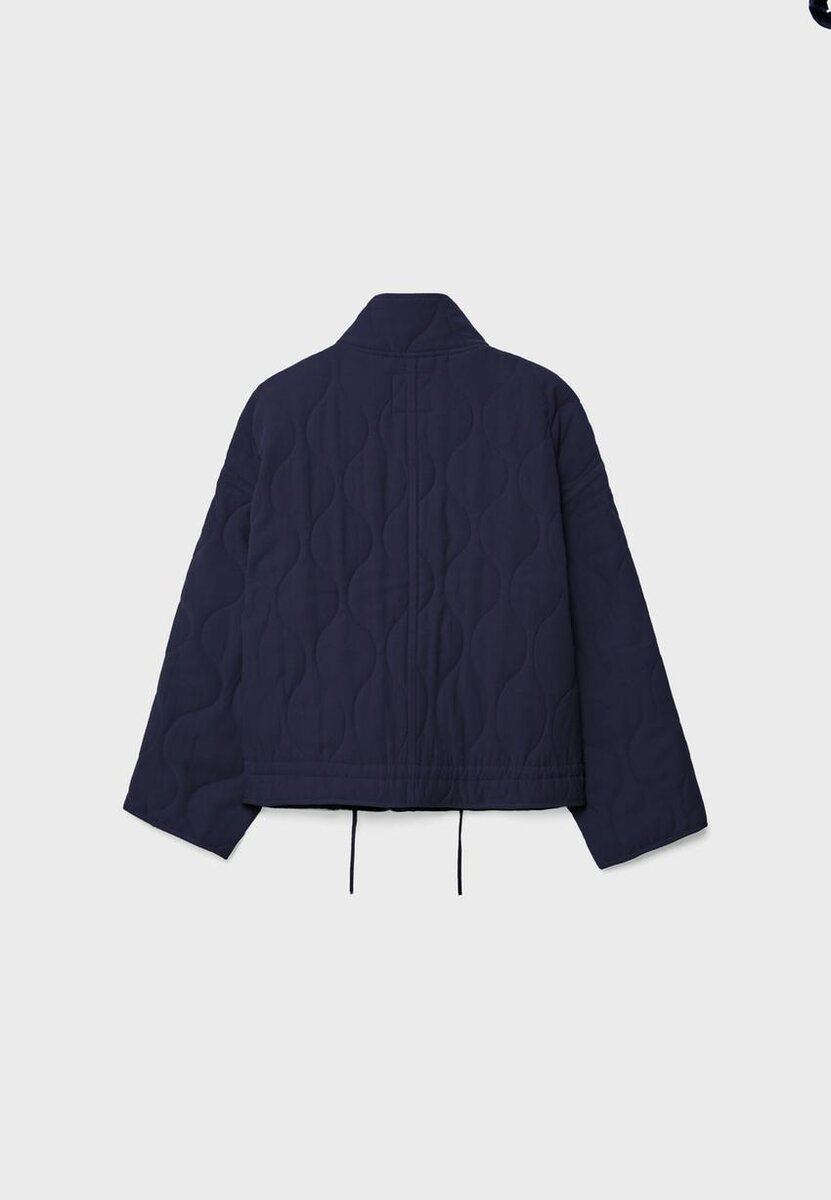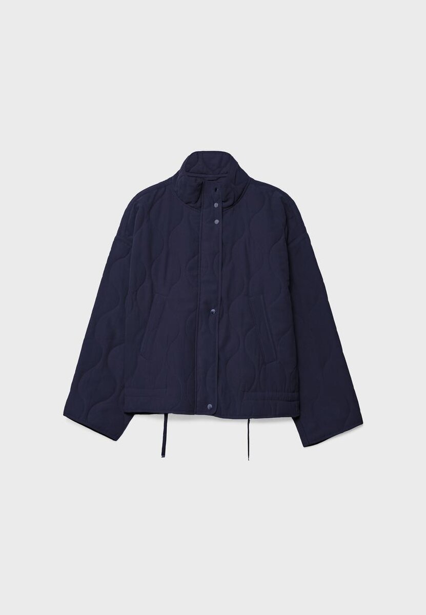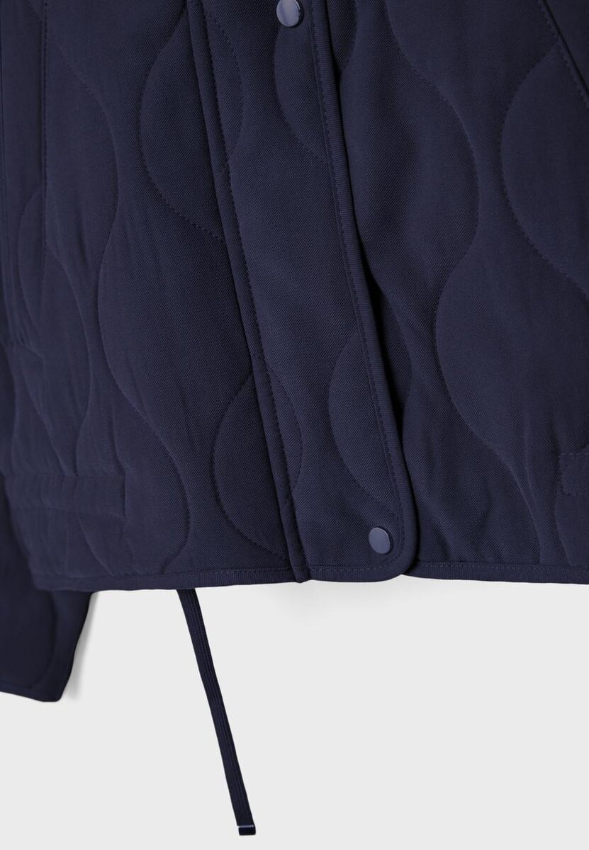 Vattert jakke med høy hals og lange ermer. Lommer med kant foran. Justerbar kant med snøring. Glidelås foran skjult av en knappeliste og trykknapper. Tilgjengelig i ulike farger.