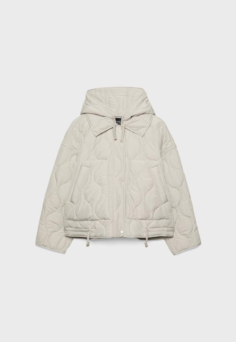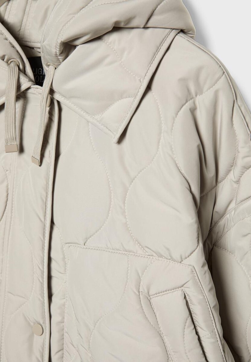 Vattert jakke med krage, avtakbar hette og lange ermer. Har lommer med kant foran, justerbar kant med matchende snøringer og glidelås foran med trykknapper. Tilgjengelig i flere farger.