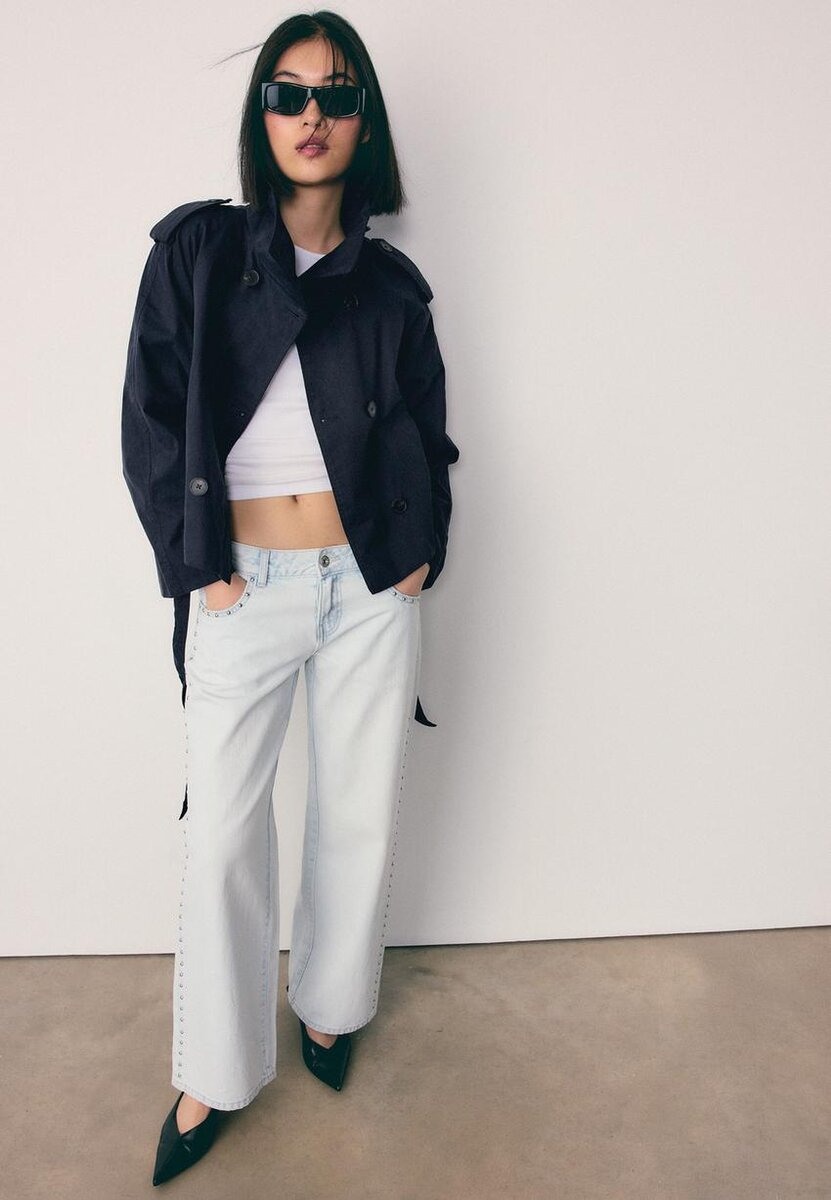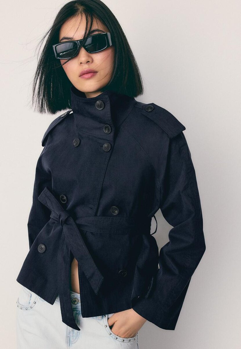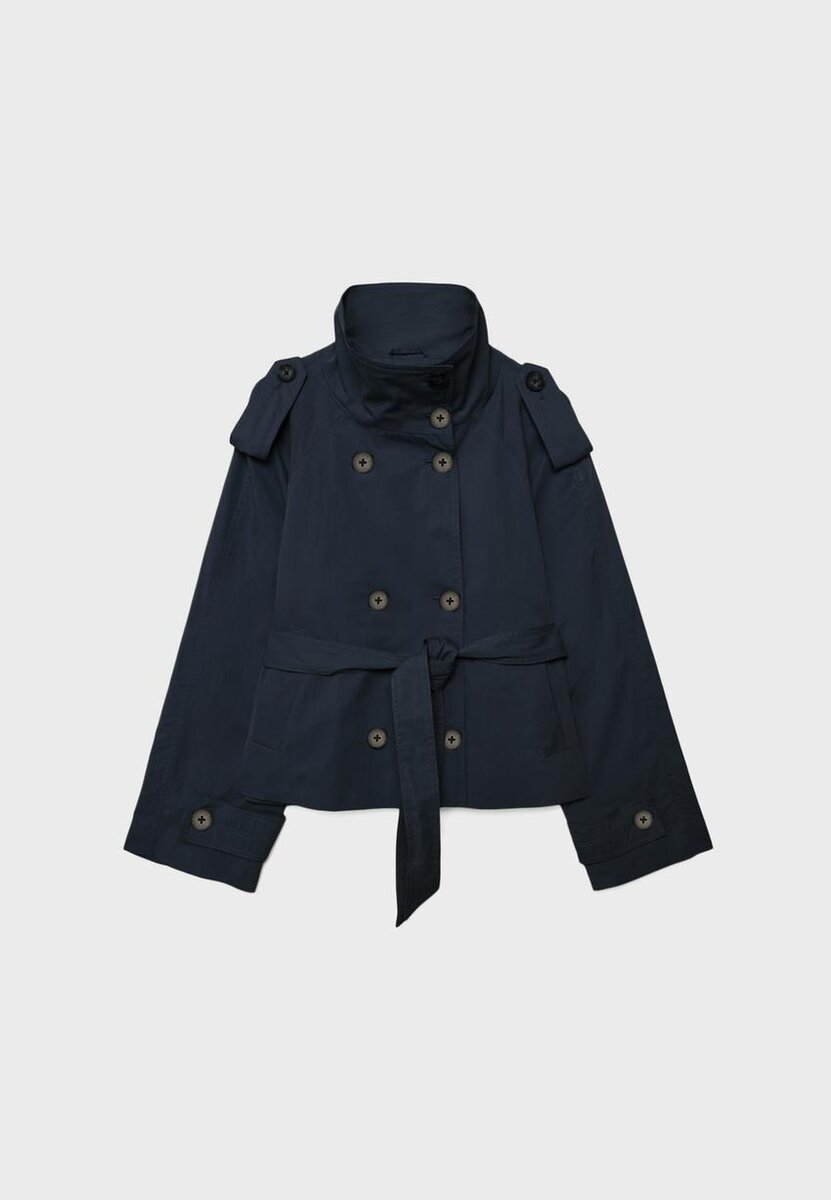 Kort, løstfallende trenchcoat med reverskrage og lange ermer med knappelukking. Sidelommer. Dobbeltspent knappelukking foran og et justerbart belte med matchende sløyfe. Tilgjengelig i flere farger.