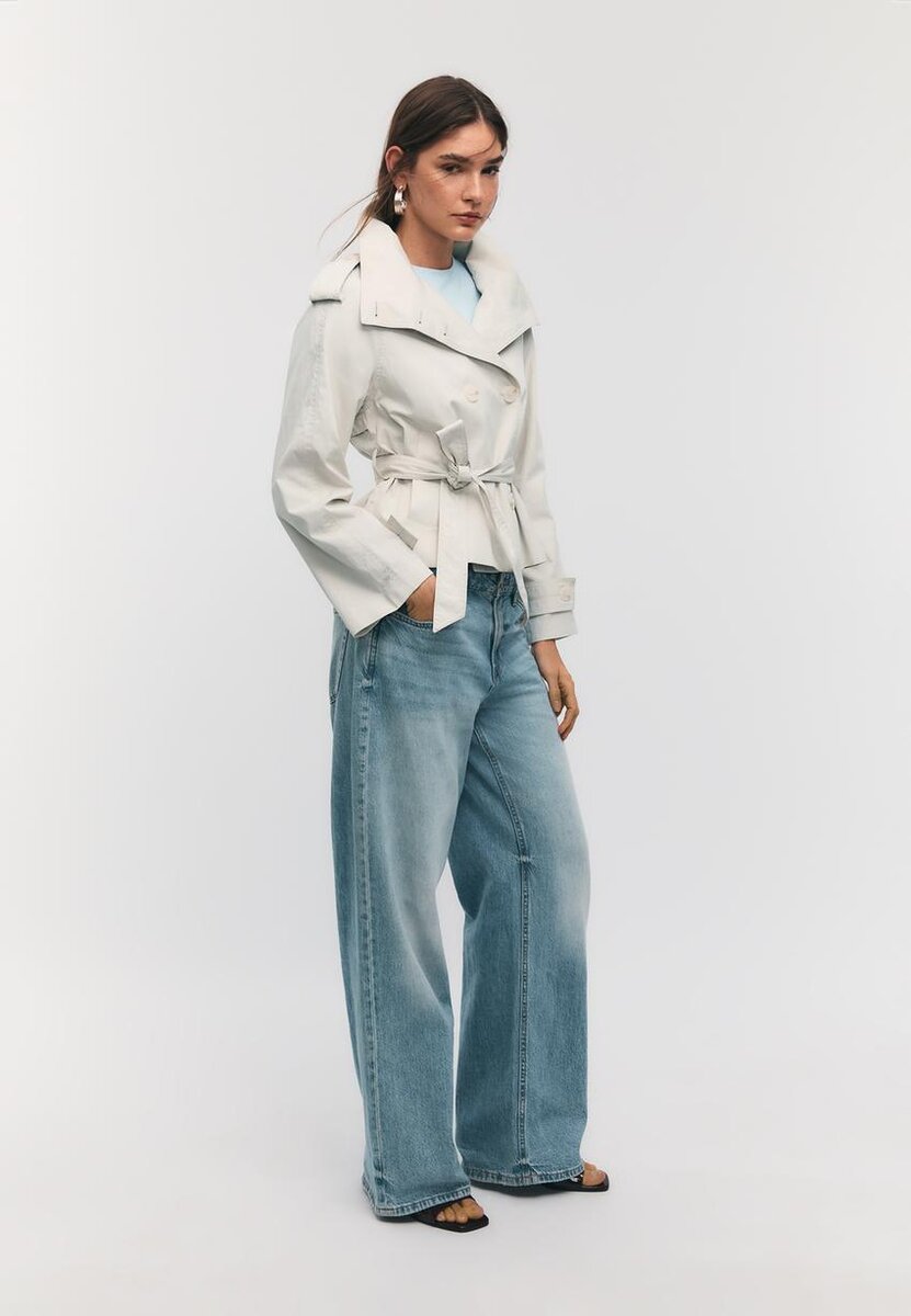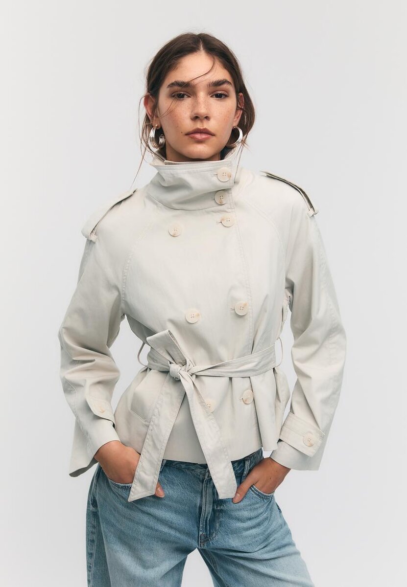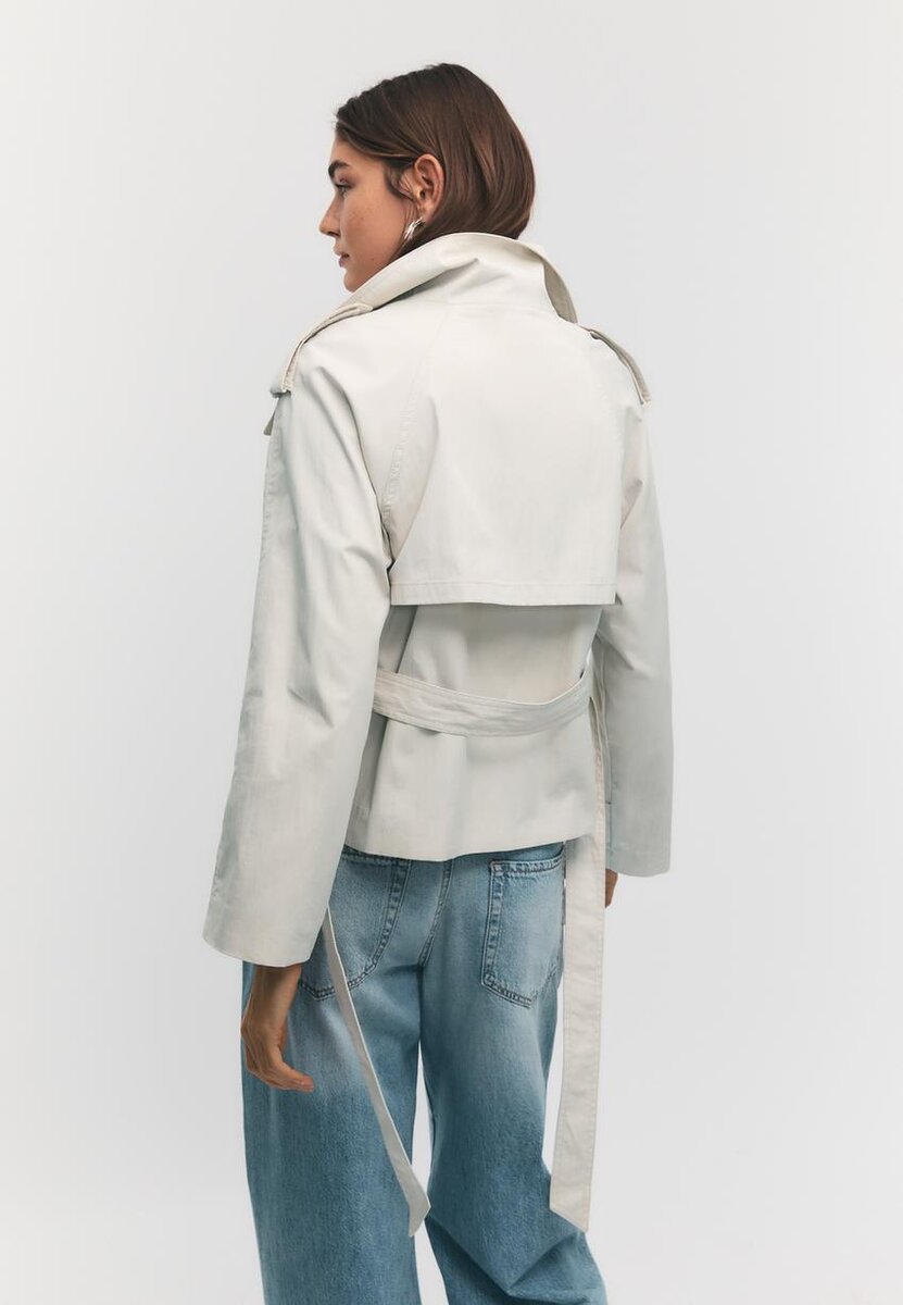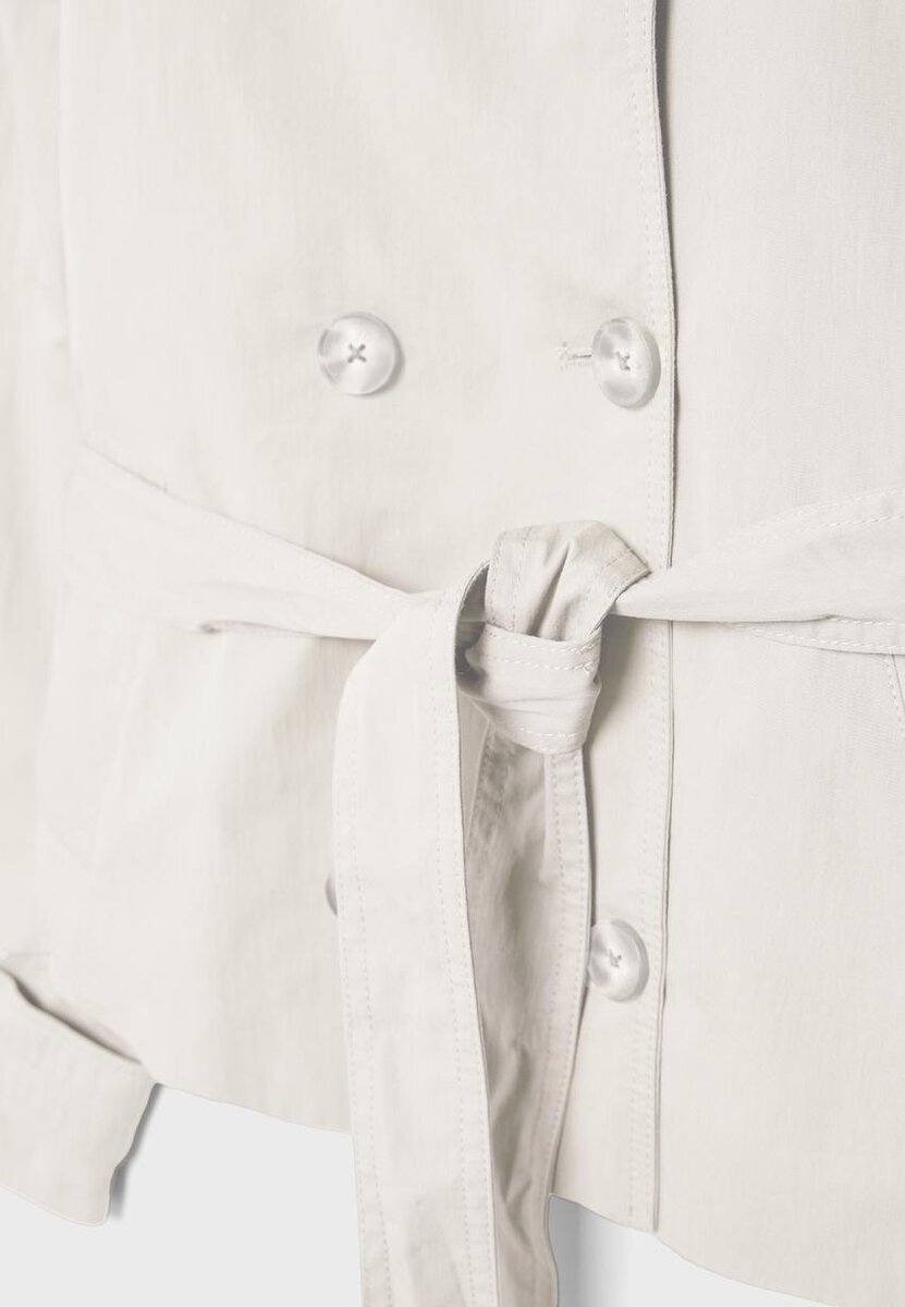 Kort trenchcoat med høy hals og lange ermer med knappelapper. Med sidelommer, dobbel knappelukking foran og matchende belte.