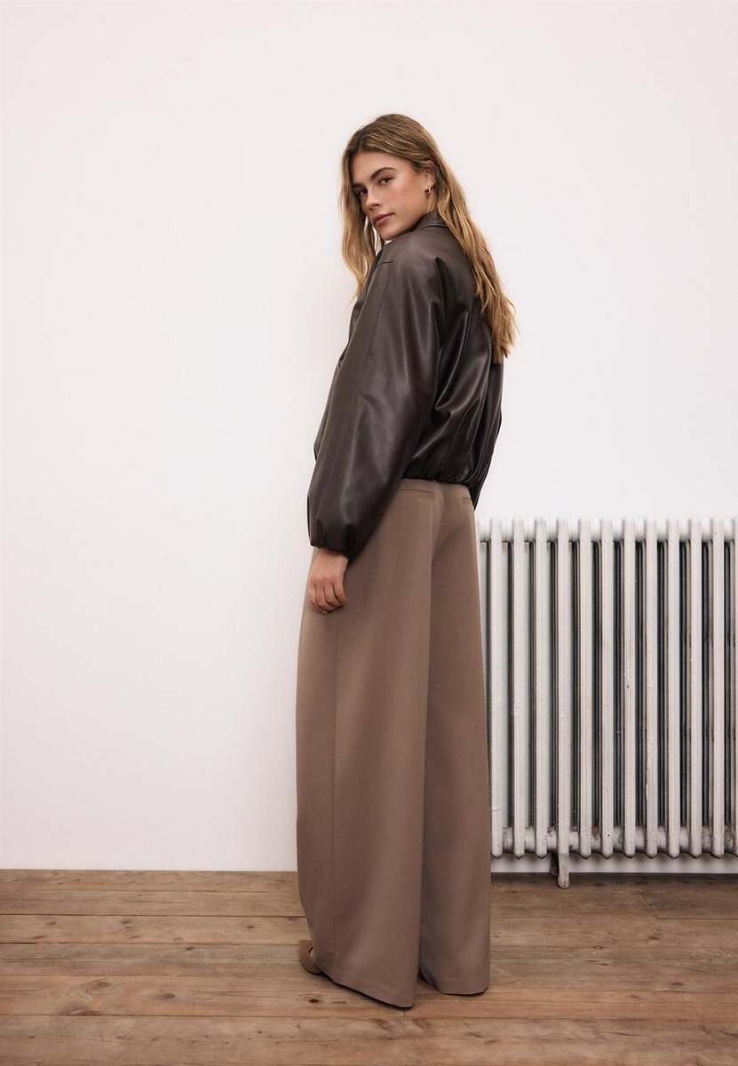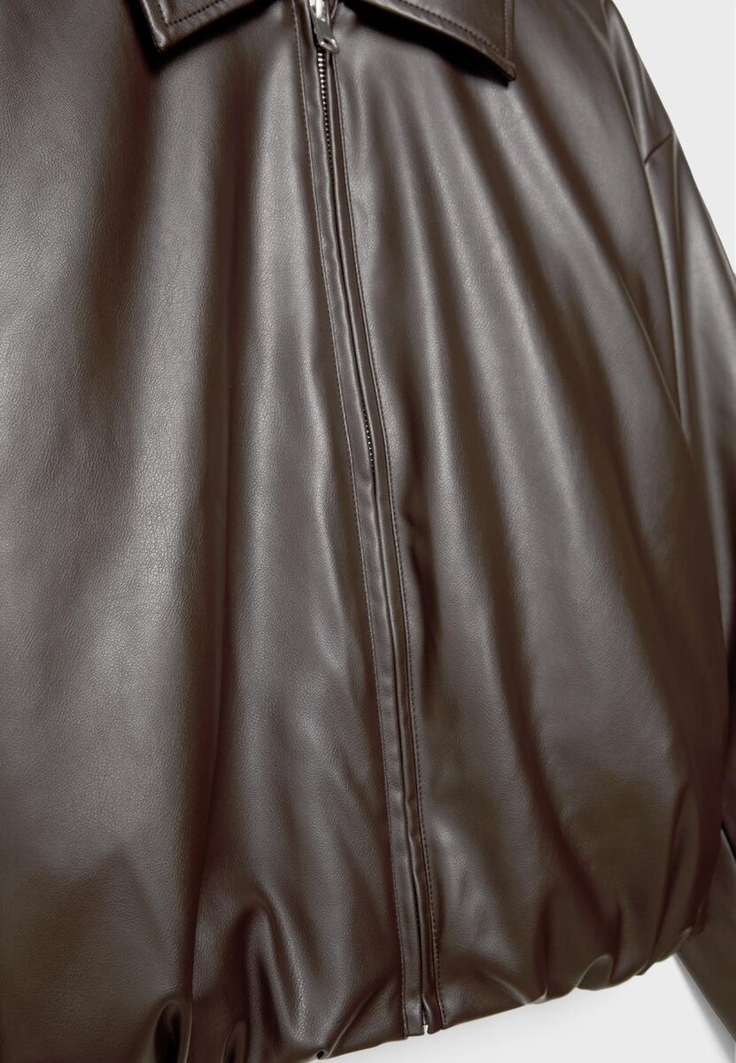 Vattert bomberjakke i skinnlignende stoff. Reverskrage og lange ermer med elastiske mansjetter. Sidelommer. Utvidet nederkant med elastikk. Lukking foran med metallglidelås.