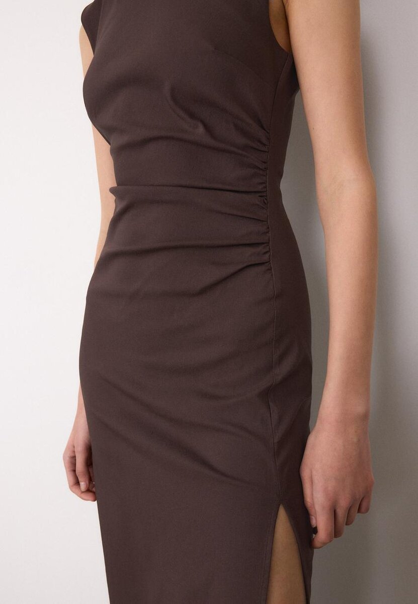Tettsittende midikjole laget av bengalin-stoff. Har rund hals og ermeløs design. Med rynkedetaljer på siden og en splittet kant. Tilgjengelig i flere farger.