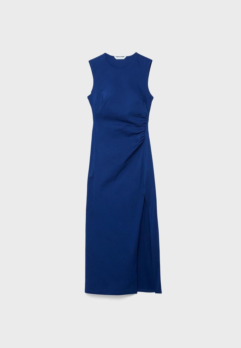 Tettsittende midikjole i bengalin. Har rund hals og ermeløs design. Med rynkedetaljer på siden og en splittet kant. Tilgjengelig i flere farger.