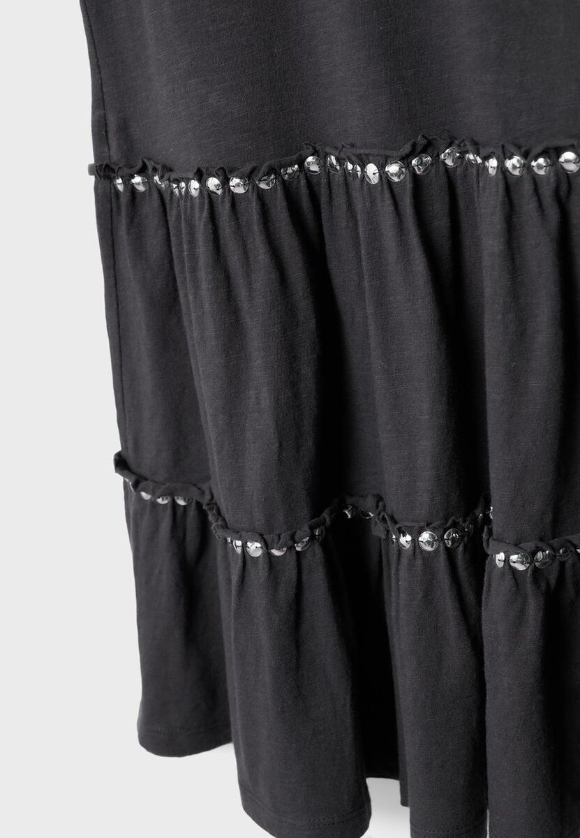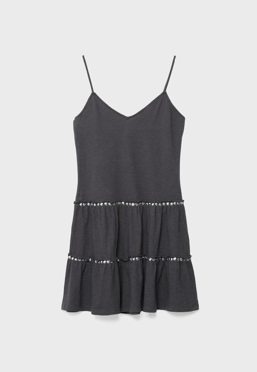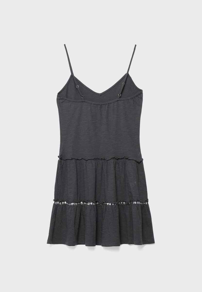 Kort kjole med V-hals og tynne stropper. Nedkant med volanger og nittedetaljer.