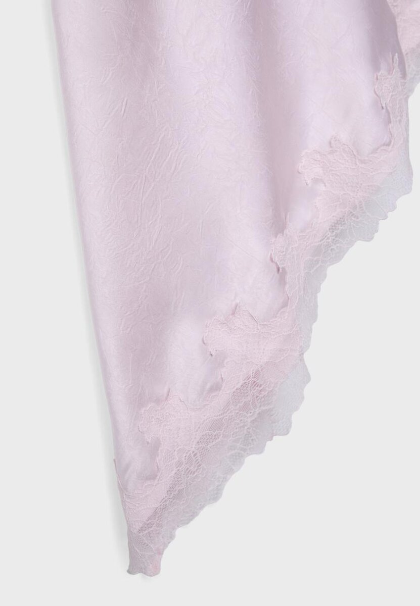 Kort kamisolekjole i stoff med sateng-effekt. Har V-hals og justerbare, smale stropper. Detaljer i ton-i-ton-blonder. Asymmetrisk kant. Lukking i siden med usynlig glidelås.