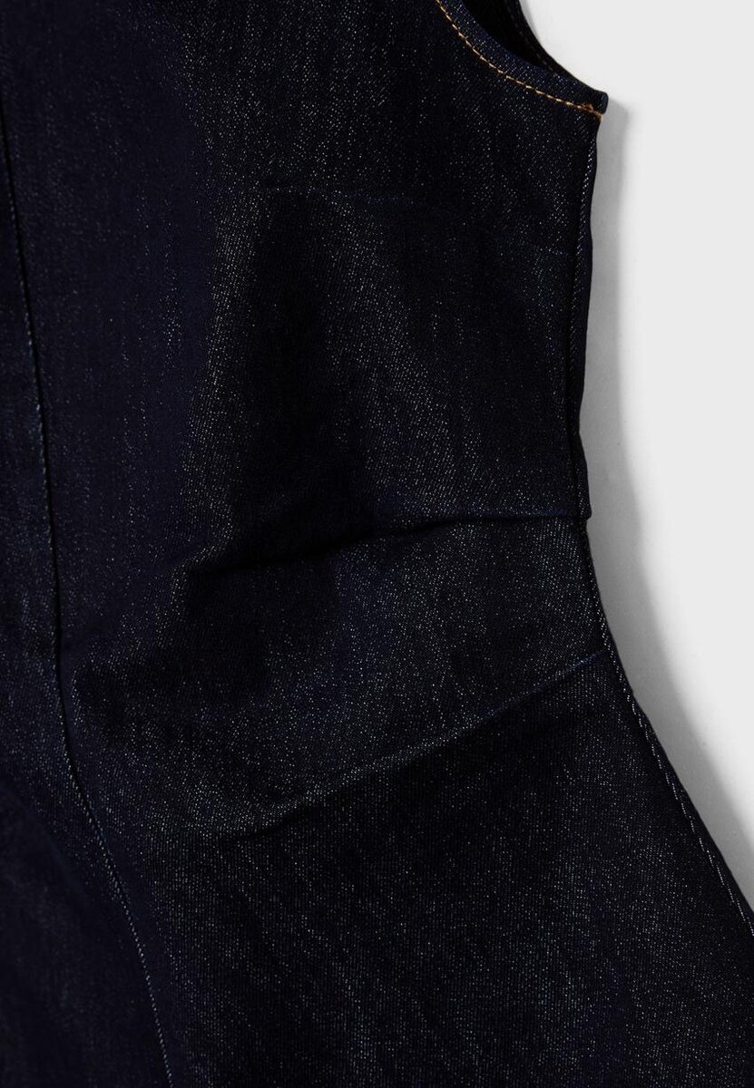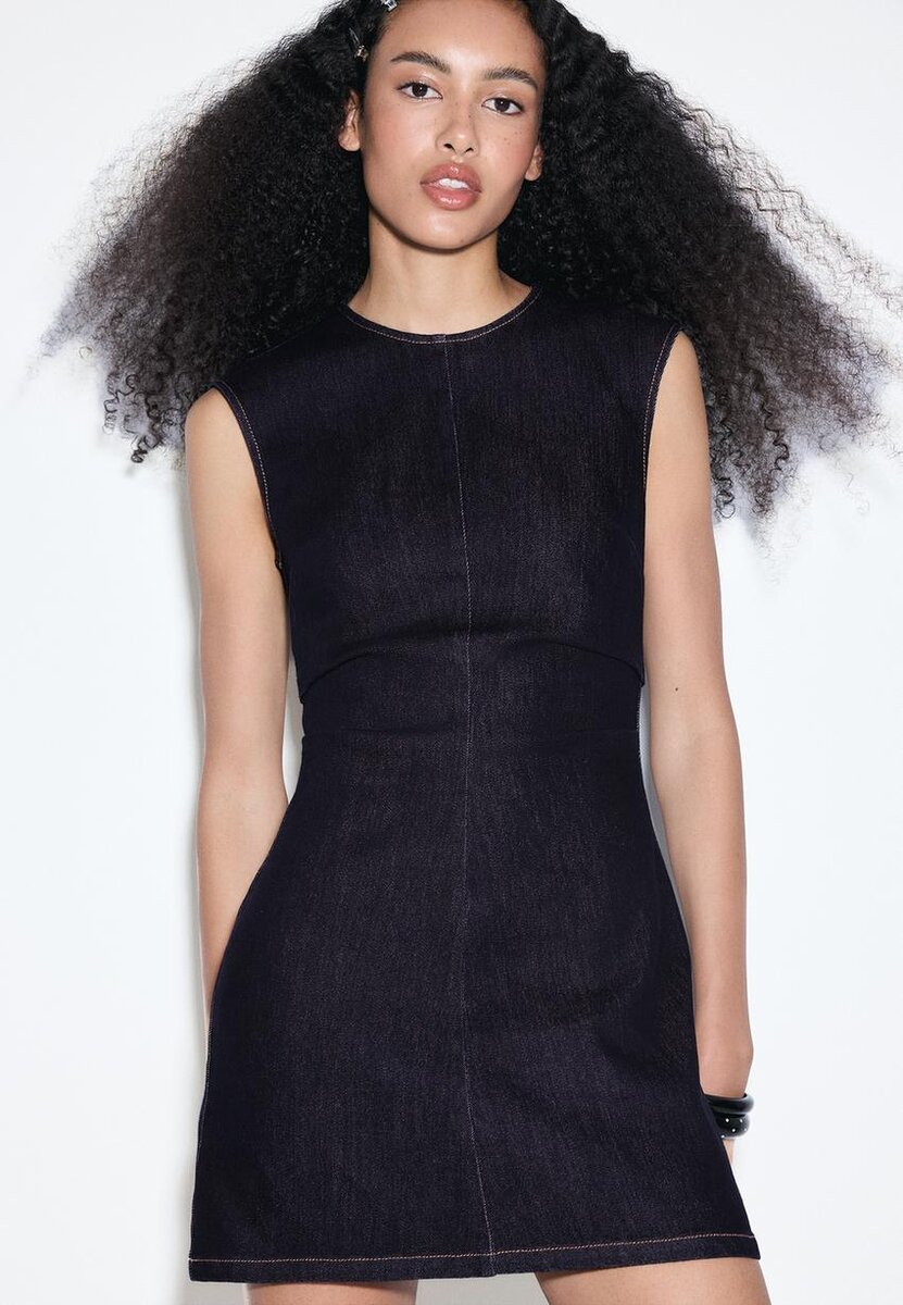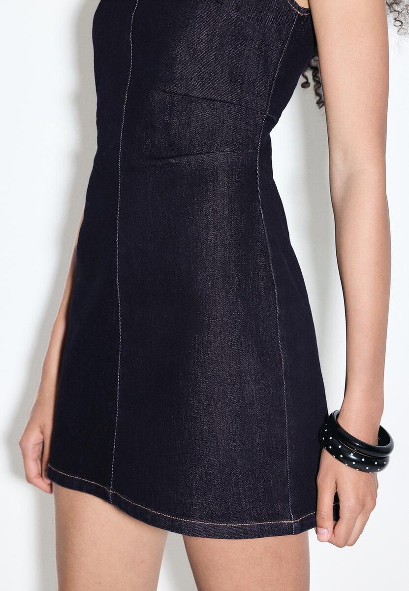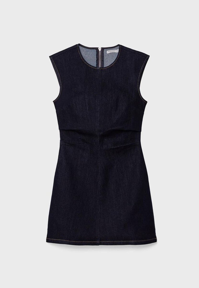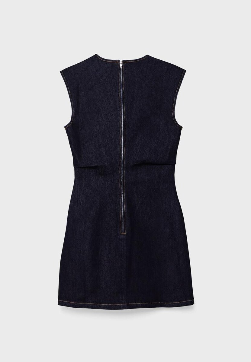 Kort, ermeløs denimkjole med rund hals. Med drapert detaljering på sidene og metallglidelås på baksiden.