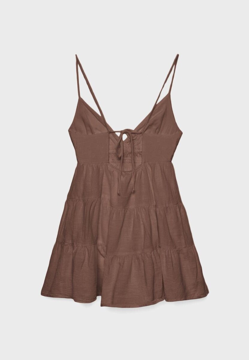 Løstsittende minikjole i bomull. Med V-hals, justerbare, tynne stropper med knytning på ryggen, åpen rygg og elastisk linning.