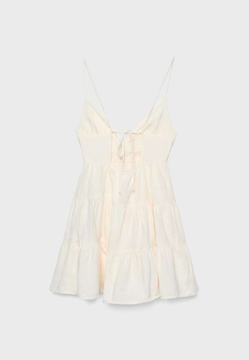 Kort, løst sittende kjole laget av bomullsstoff. Med V-hals og justerbare spaghettistropper med knytning på baksiden. Åpen rygg og elastisk midje.