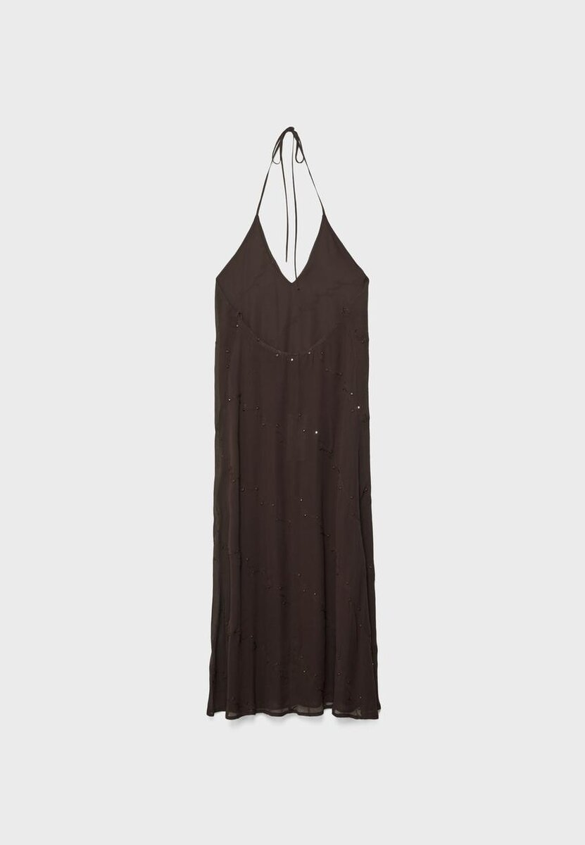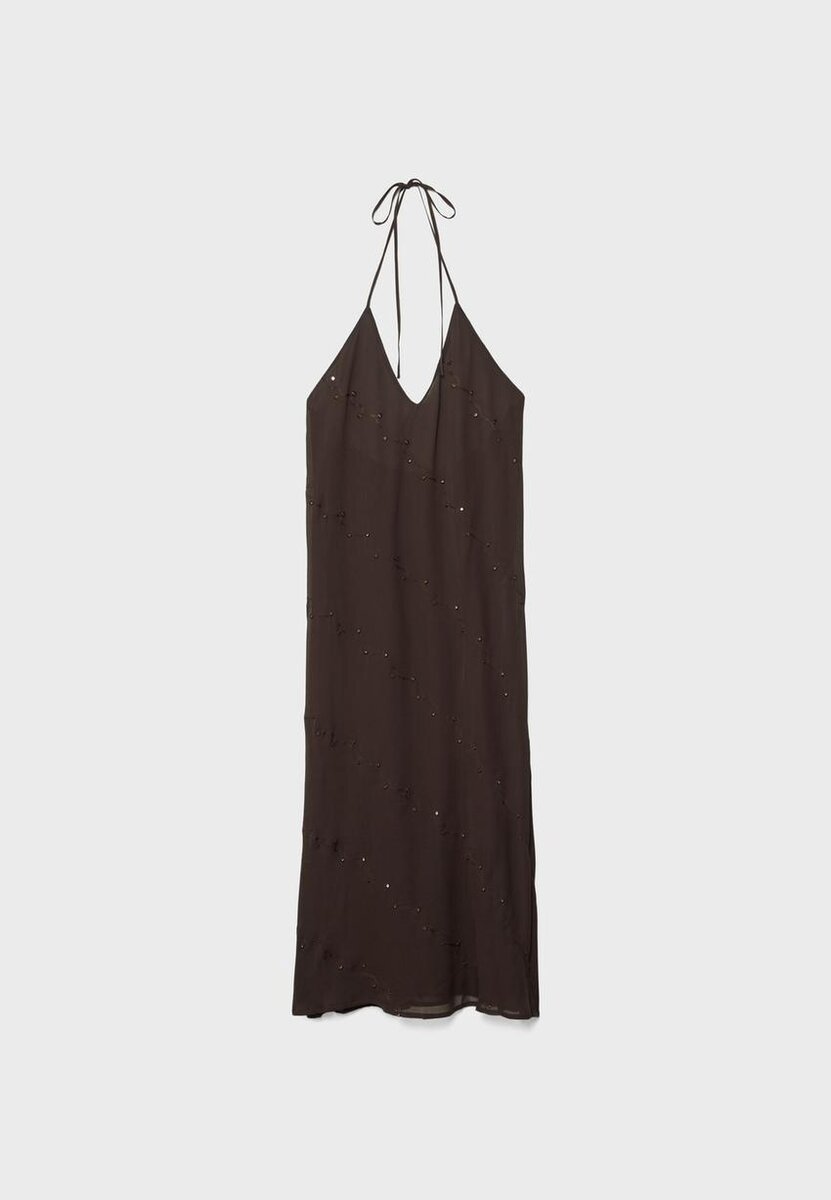 Lang kjole laget av viskose. V-utringning og tynne stropper som knyttes i nakken. Åpen rygg. Rett silhuett. Applikasjoner med paljettbroderi. Innvendig fôr.