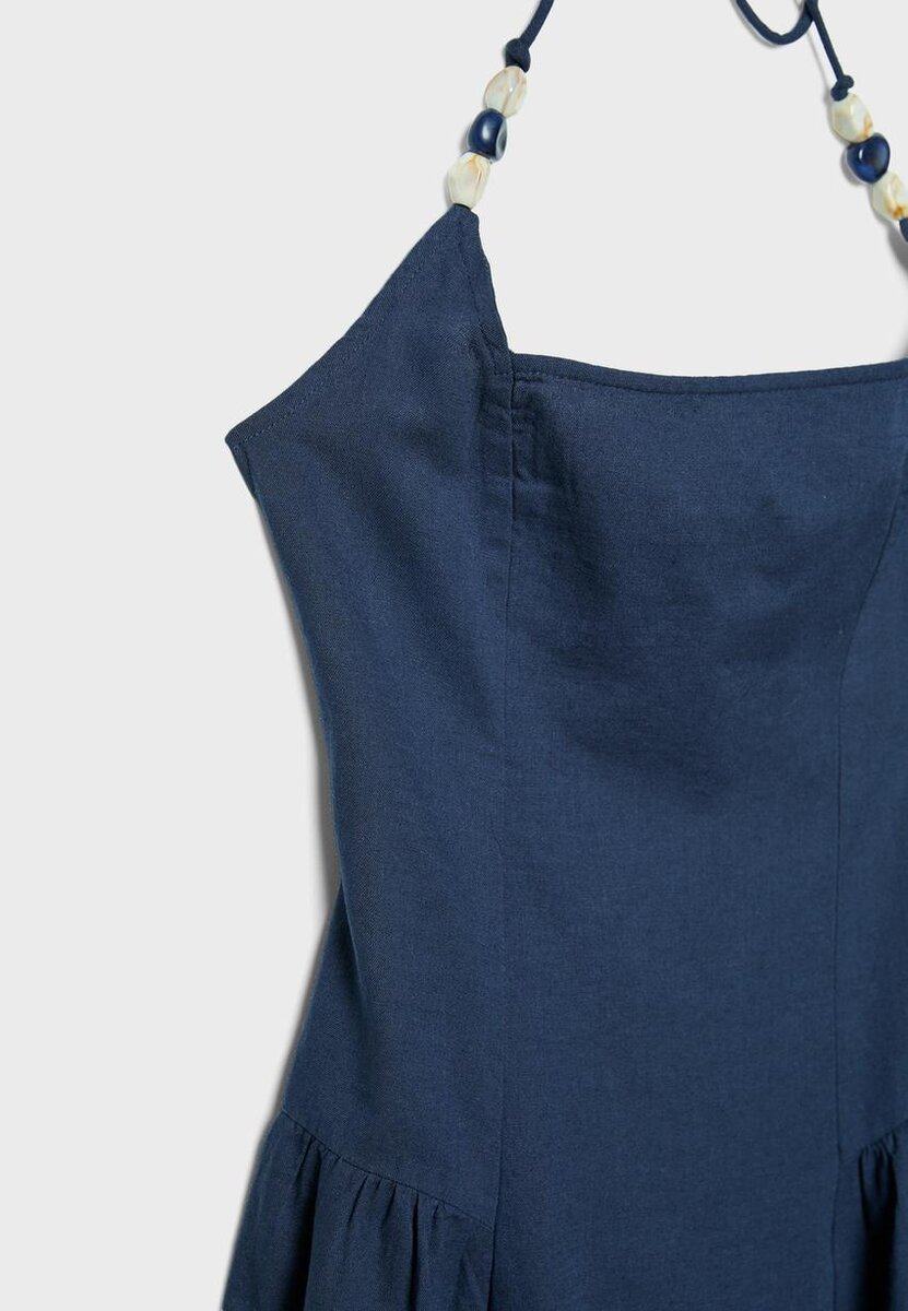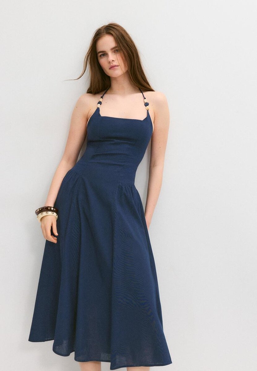 Midi-kjole laget av et bomullsblandingsstoff med 12 % lin. Med rett halsutringning og delikate stropper som knyttes i nakken med perledetaljer. Åpen rygg. A-linje-silhuett. Rynket detalj i midjen. A-linjeformet kant. Innvendig fôr. Knytning i nakken.