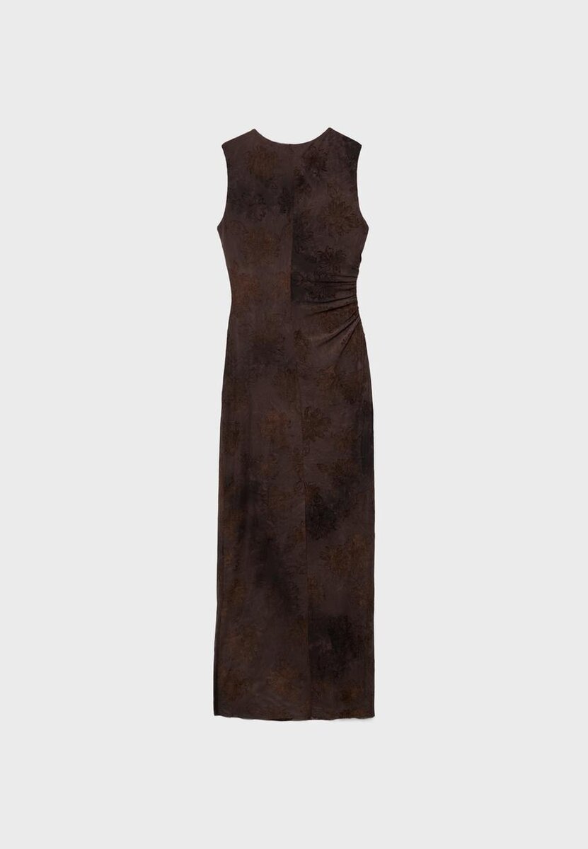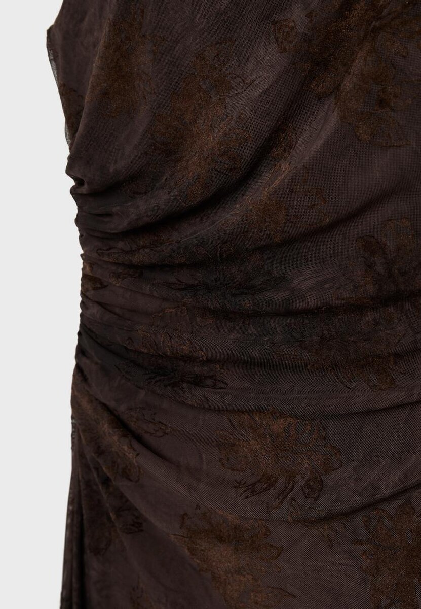 Midi-kjole laget av mønstret tyllstoff. Firkantet utringning og ermeløs. Rynket stoffdetalj på siden. Matchende fôr.