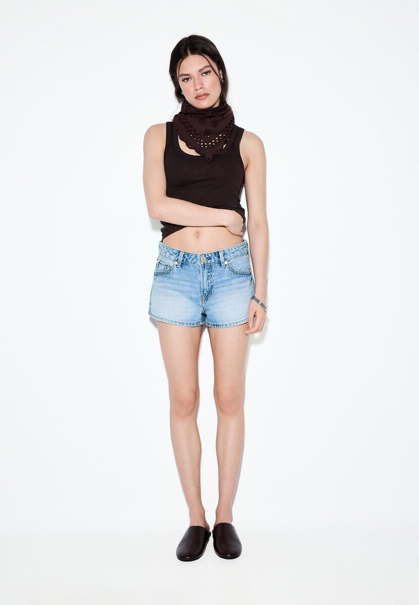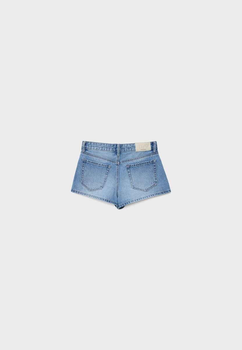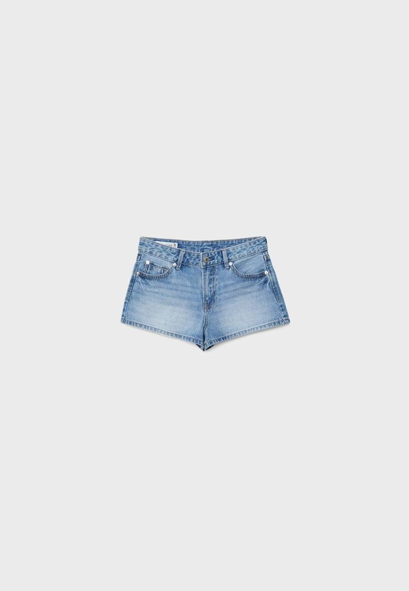 Denimshorts med lav midje. Med beltehemper og fem lommer. Gylf med glidelås og metallknapp øverst. Tilgjengelig i flere farger.