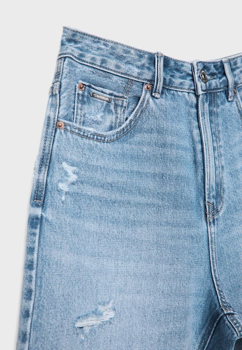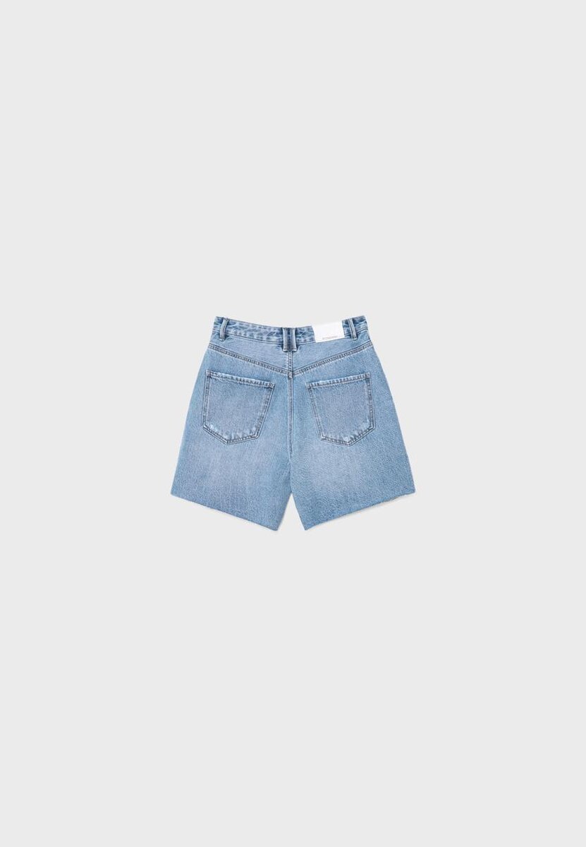 Lange bermuda-shorts med fem lommer, laget av bomull. Høy midje med beltestropper. Lommer foran og påsydde lommer bak. Glidelås og metallknapp. Tilgjengelig i flere farger.
