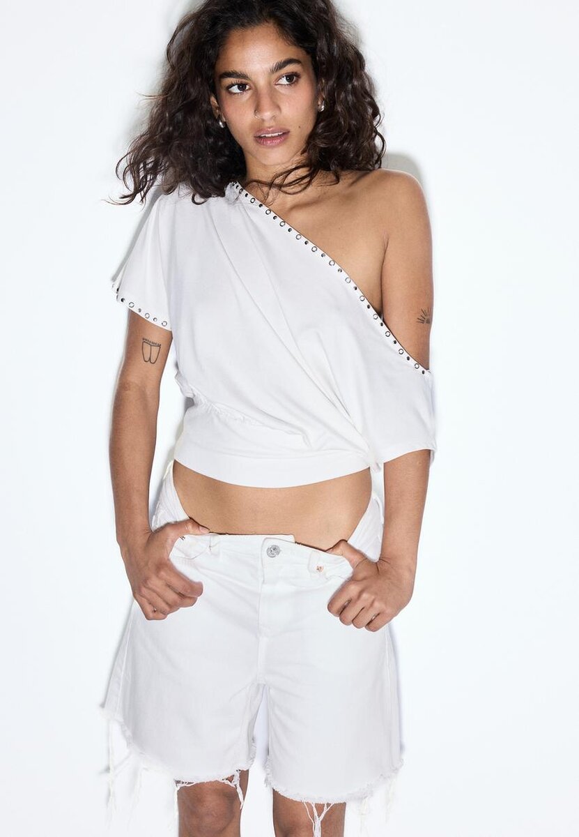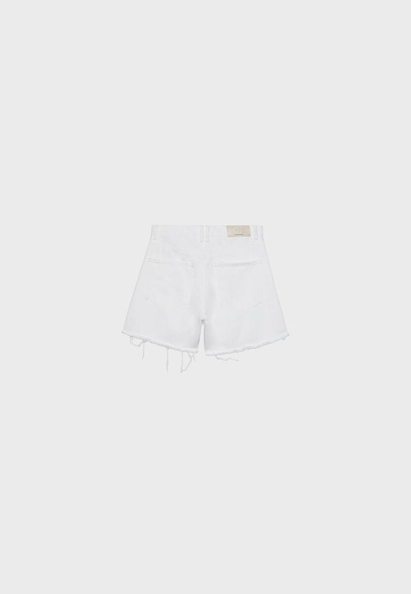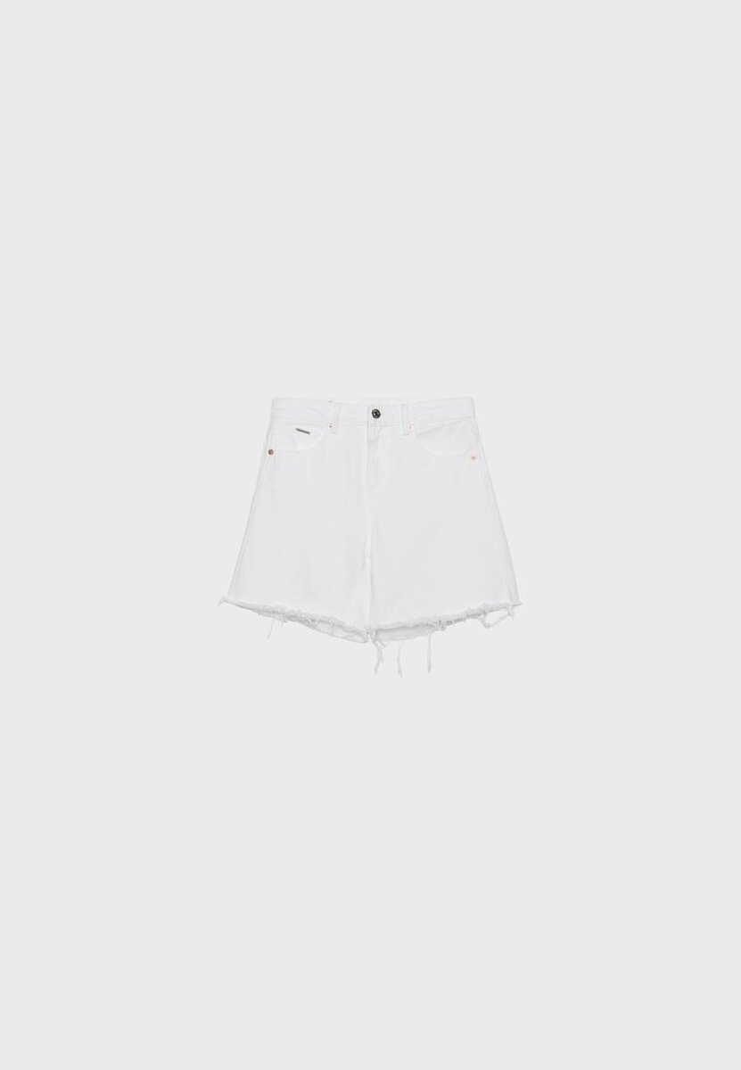 Lange bermuda-shorts med fem lommer, laget av bomull. Høy midje med beltestropper. Lommer foran og påsydde lommer bak. Glidelås og metallknapp. Tilgjengelig i flere farger.