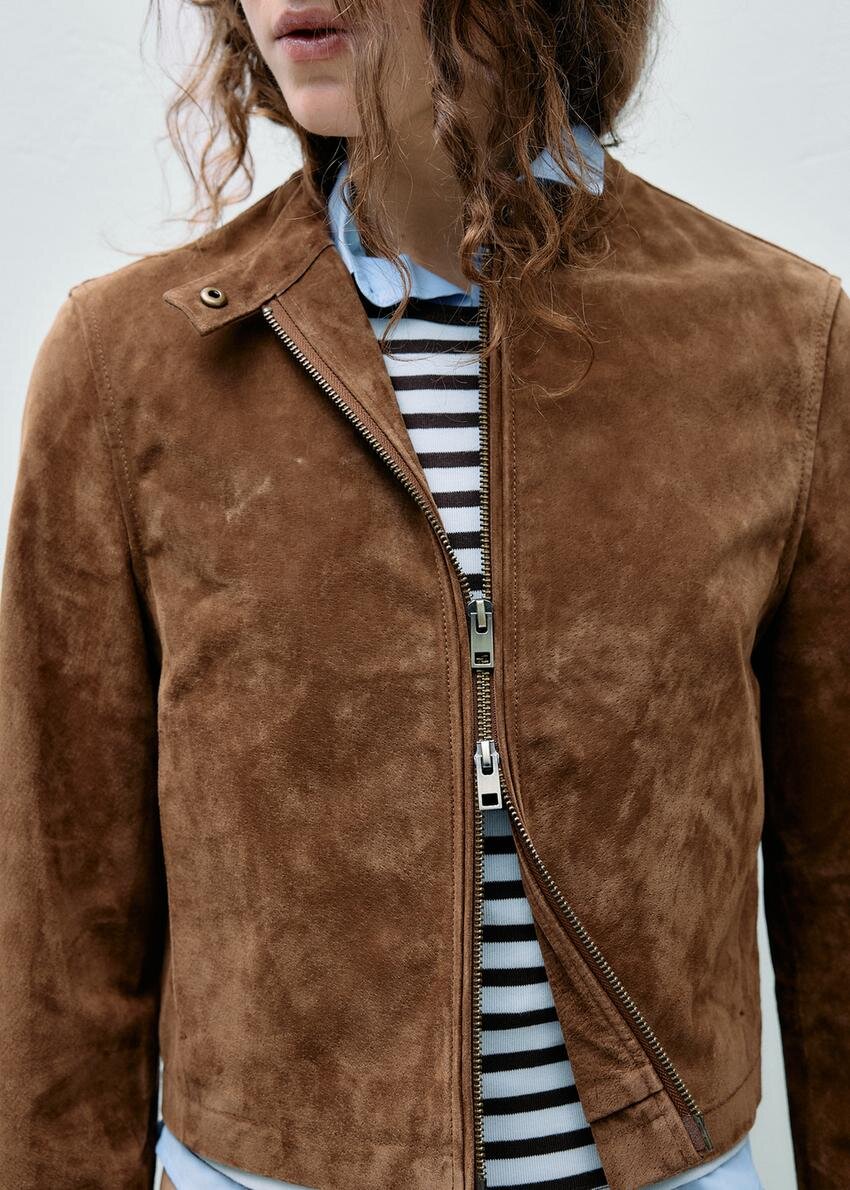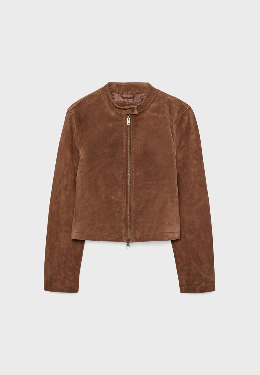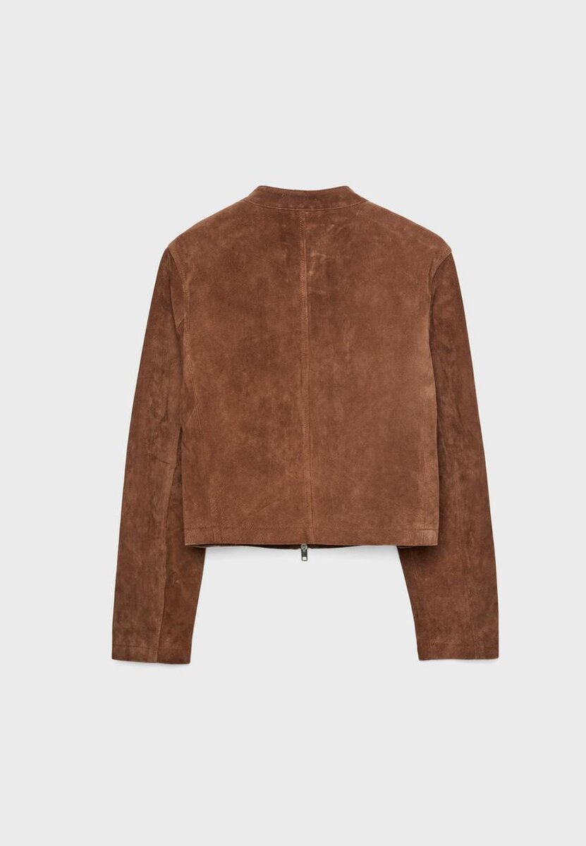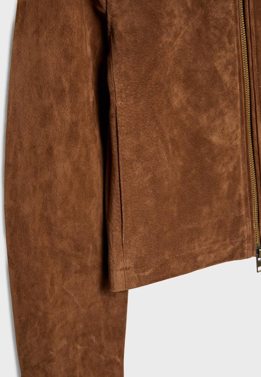 Kort jakke laget av 100 % svineskinn med polyesterfôr. Med høy hals med knapp og lange ermer. Sidelommer. Lukking foran med toveis glidelås.