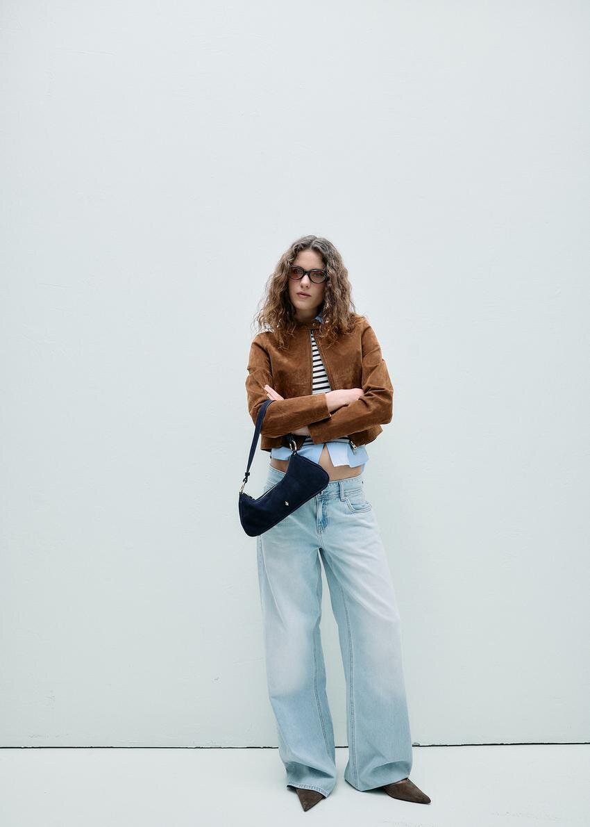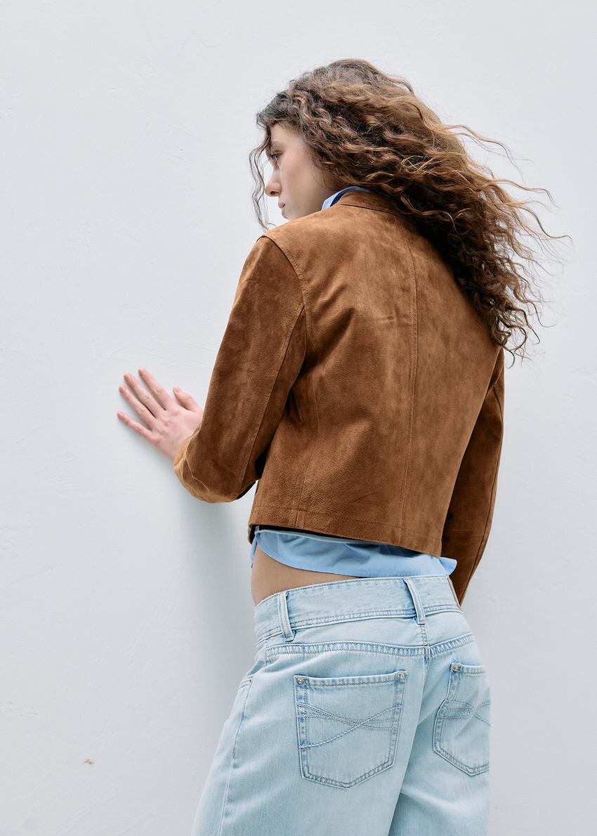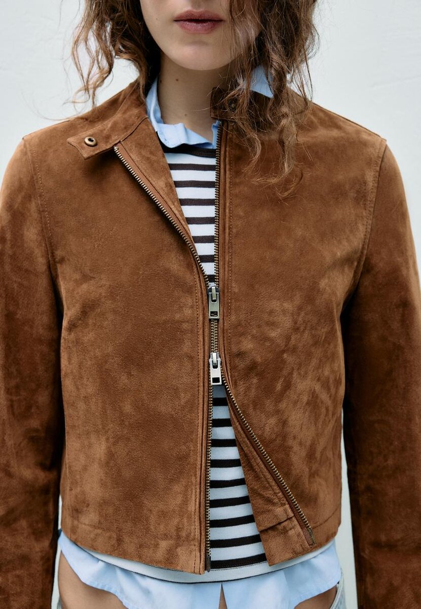 Kort jakke laget av 100 % svineskinn med polyesterfôr. Med høy hals med knapp og lange ermer. Sidelommer. Lukking foran med toveis glidelås.