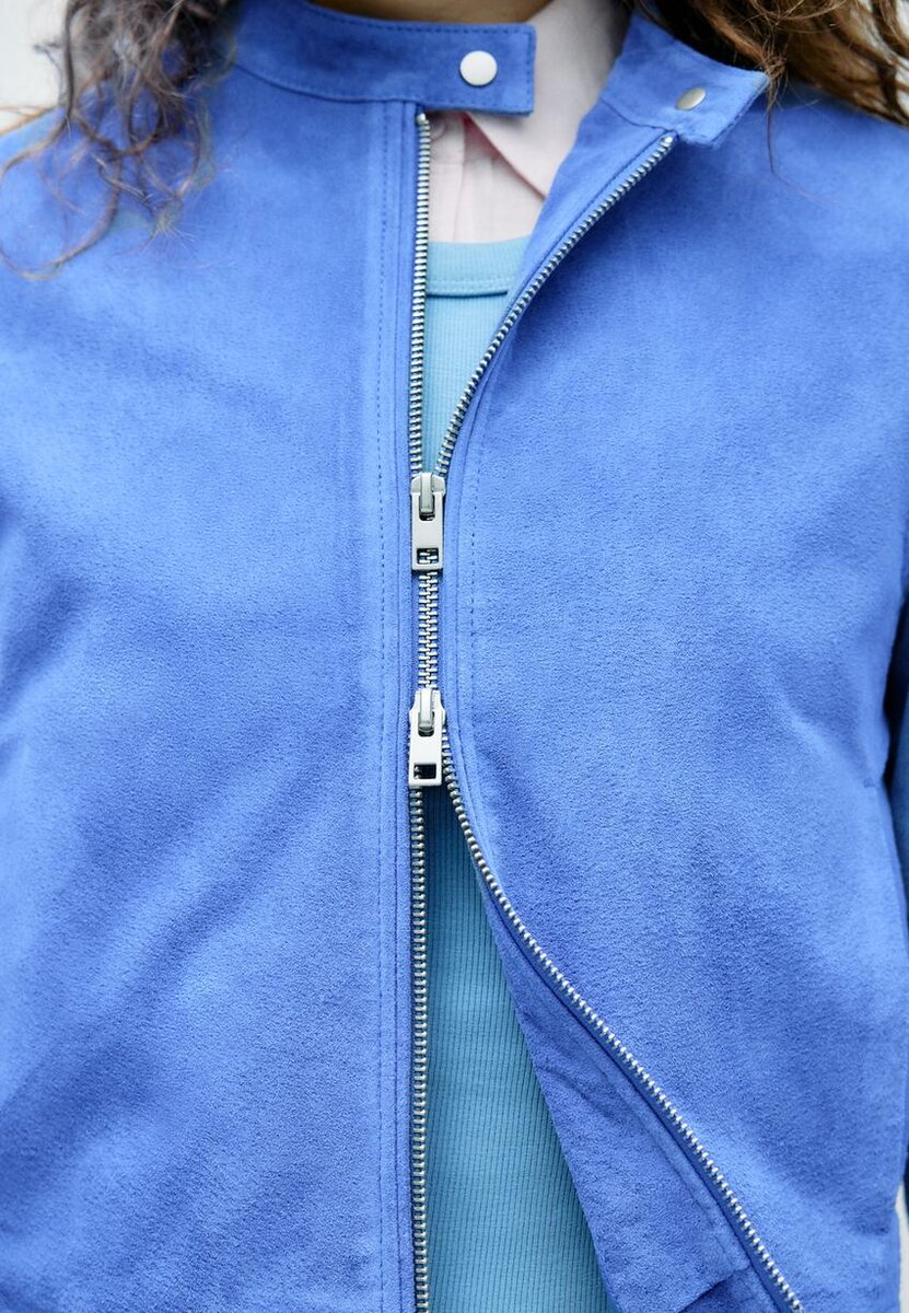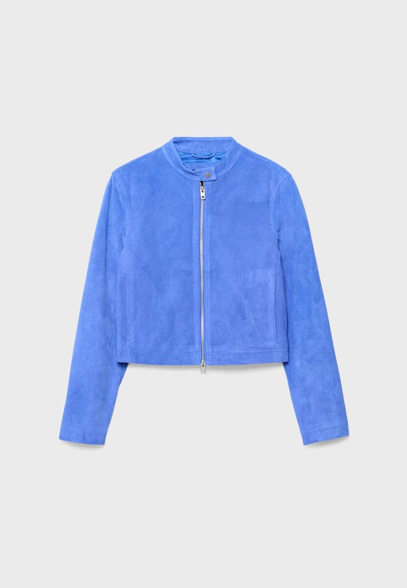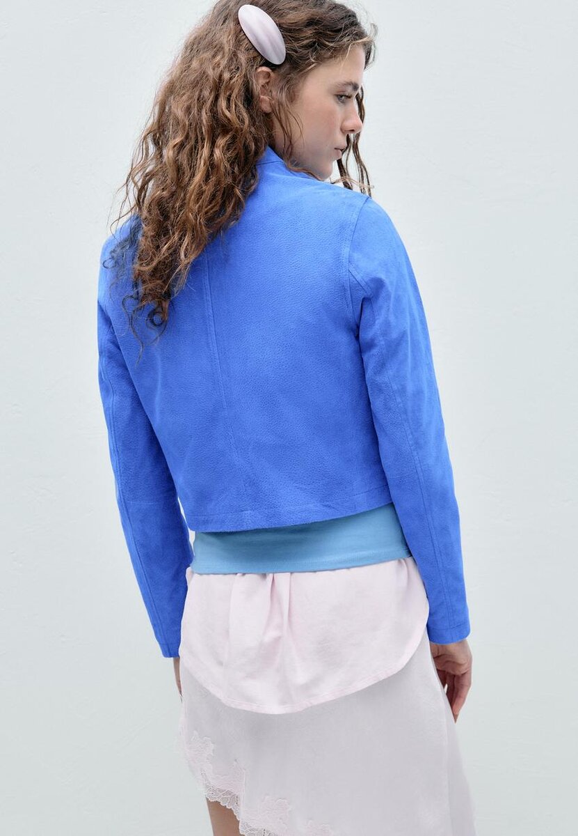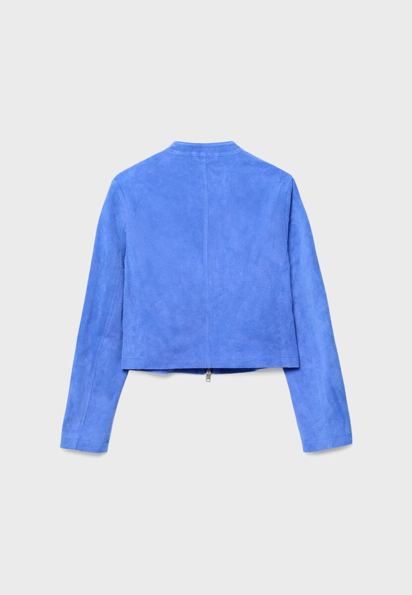 Kort jakke laget av hovedsakelig svineskinn og polyesterfôr. Med høy hals med knapp og lange ermer. Sidelommer. To-veis glidelås foran.