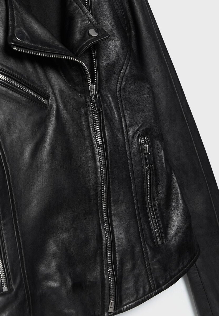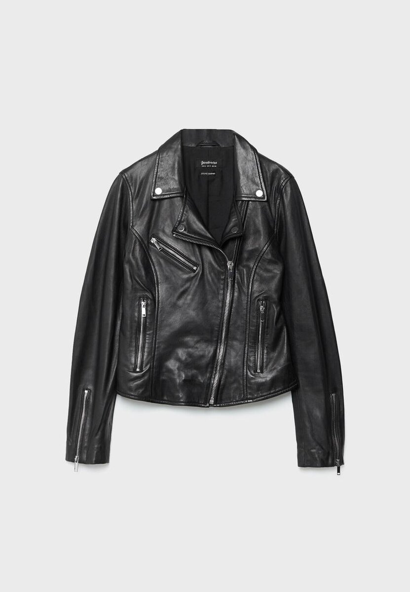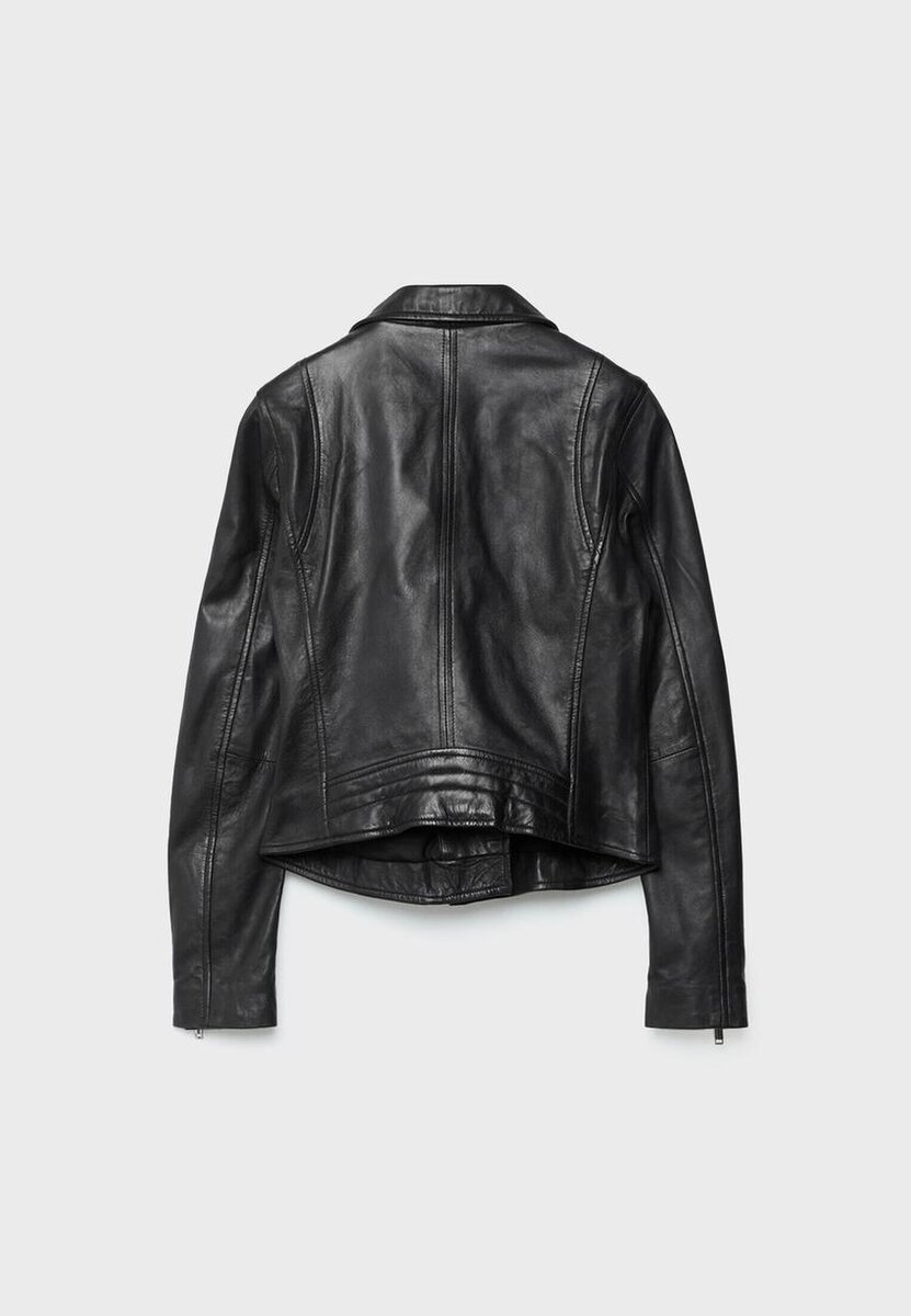 Jakke i bikerstil med krage med utskjæring og lange ermer med glidelås i mansjettene. Glidelås foran med kryssdetalj og trykknapper på kragen. Lommer foran.