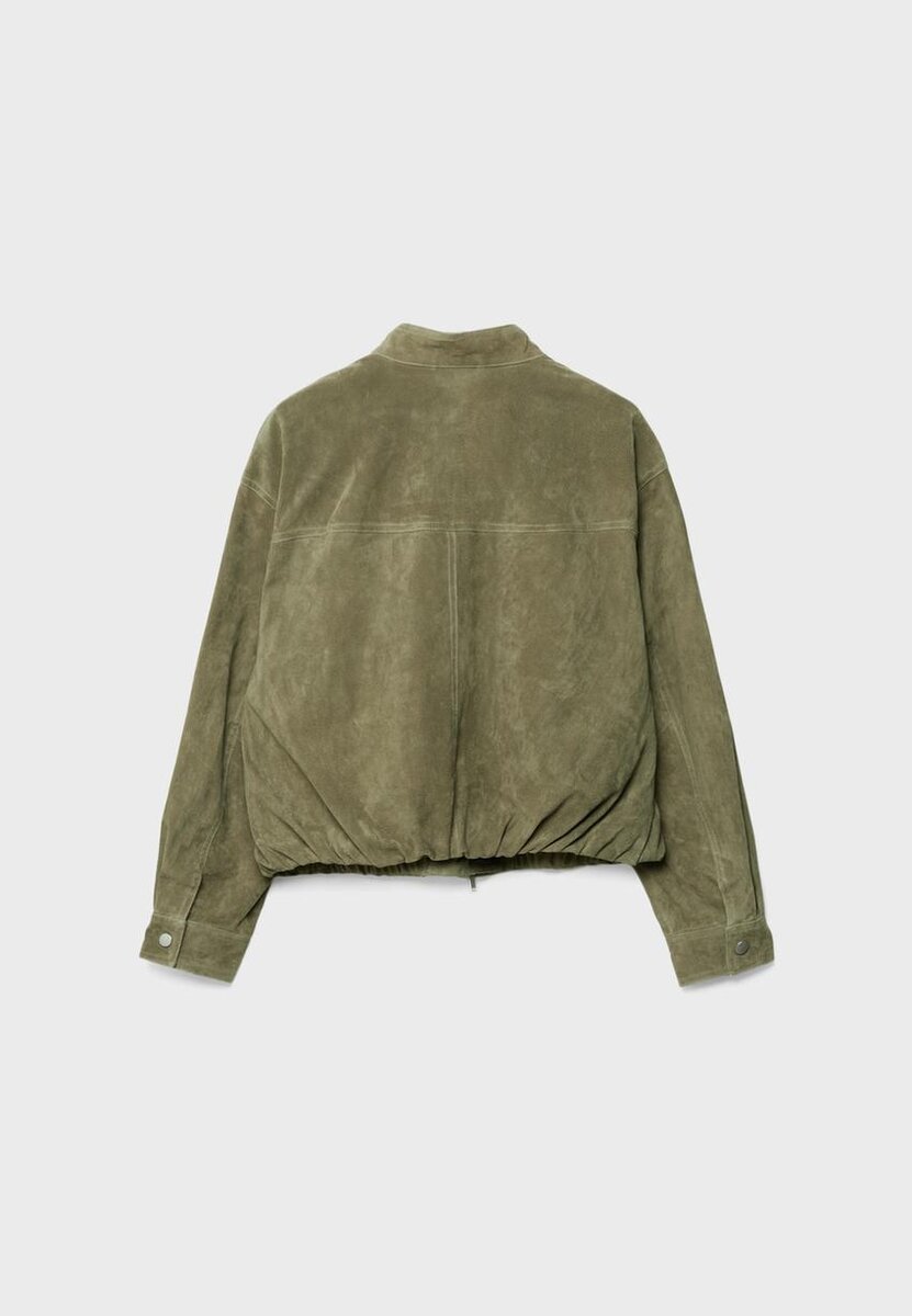 Skinnjakke med hovedmateriale i skinn og fôr i polyester. Høy hals og lange ermer. Glidelås foran og ballongkant nederst. Lommer foran med klaff og metallknapper.