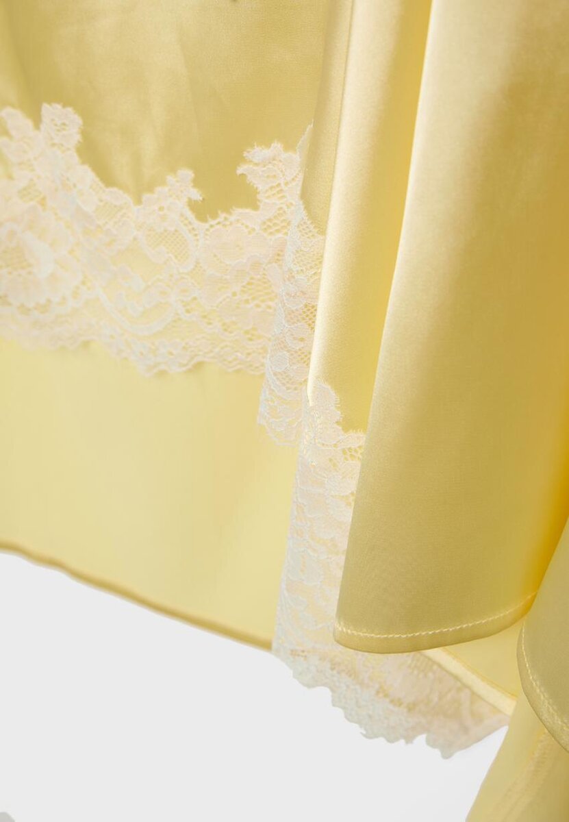 Midi-skjørt med asymmetrisk snitt laget av satengstoff. Justerbar midje med båndlukking foran. Asymmetrisk kant med blonderapplikasjon.