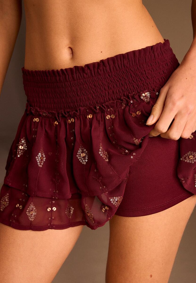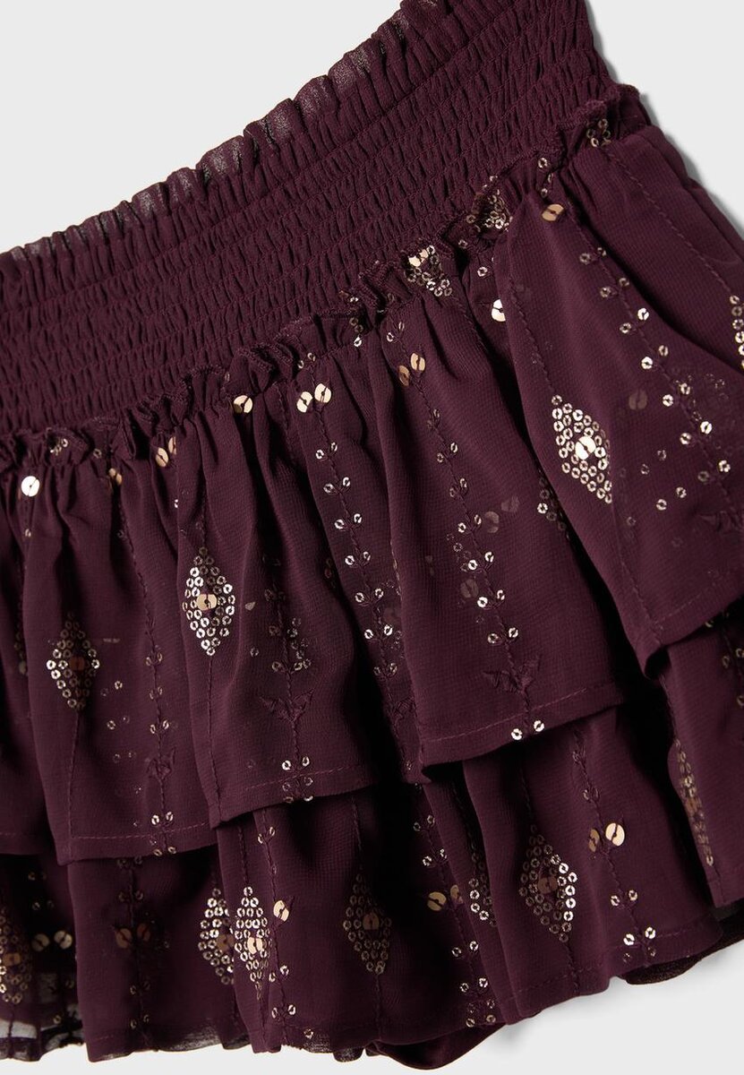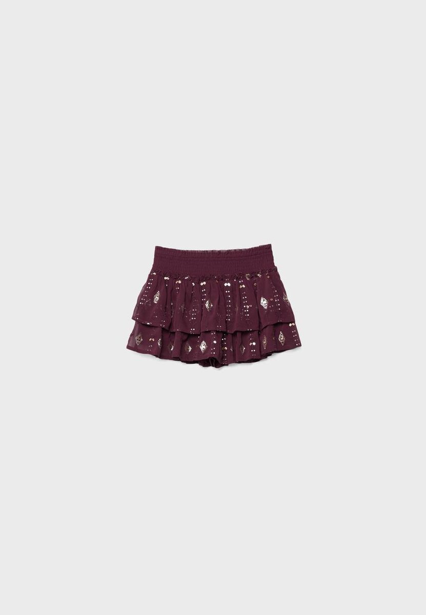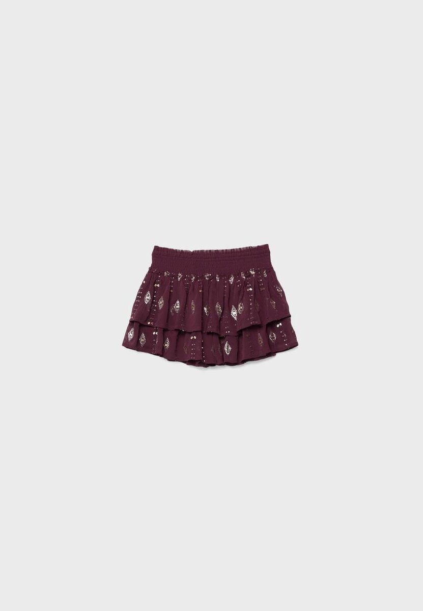Flytende skjørt med middels høy midje og elastisk volang i linningen. Med broderidetaljer.