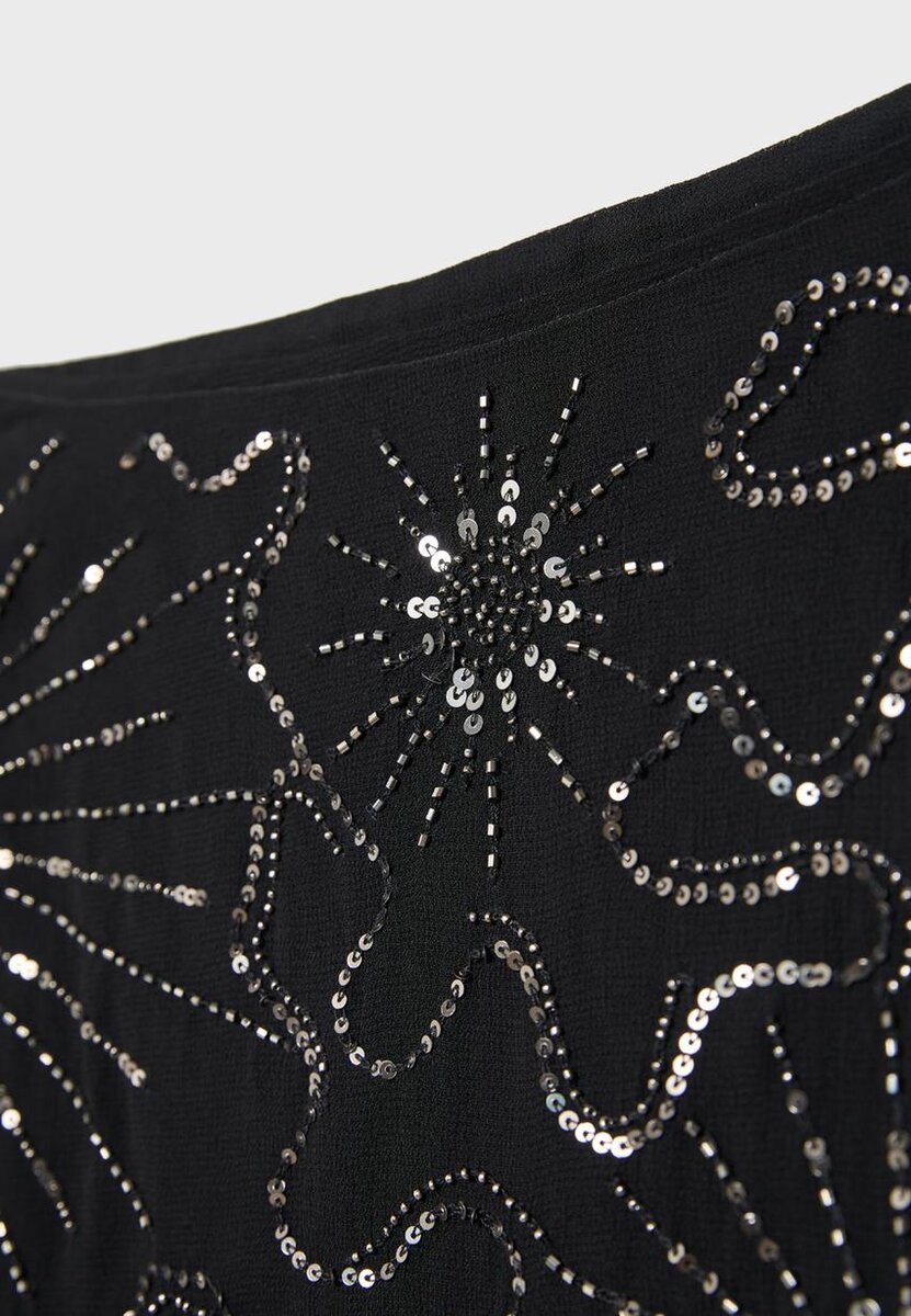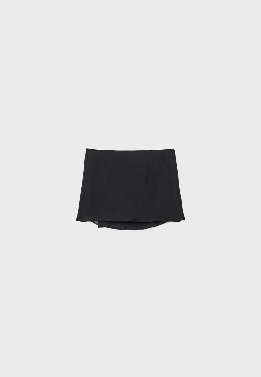 Kort skort i omslagsstil laget av viskose. Høy midje. Med broderi og perleapplikasjoner foran. Innvendig fôr. Bindebånd i siden.