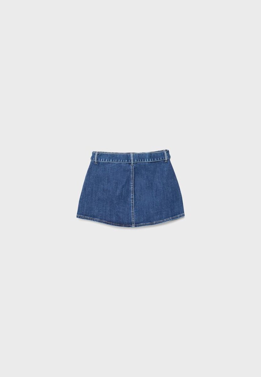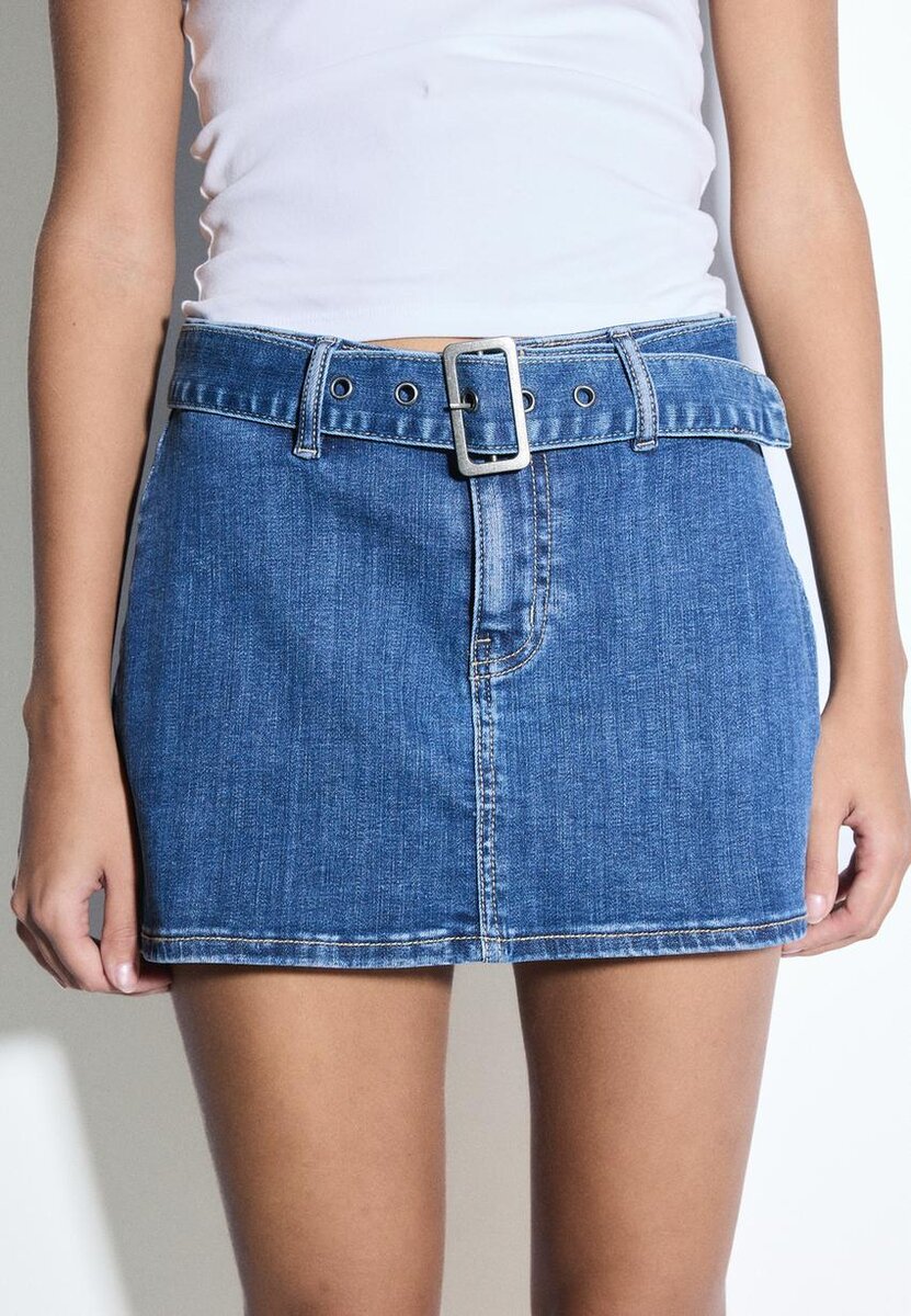 Denimskort. Glidelås foran og metallknapper. Med belte i samme stoff.