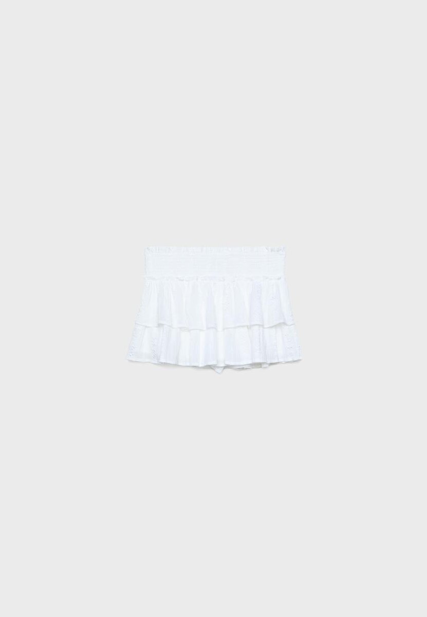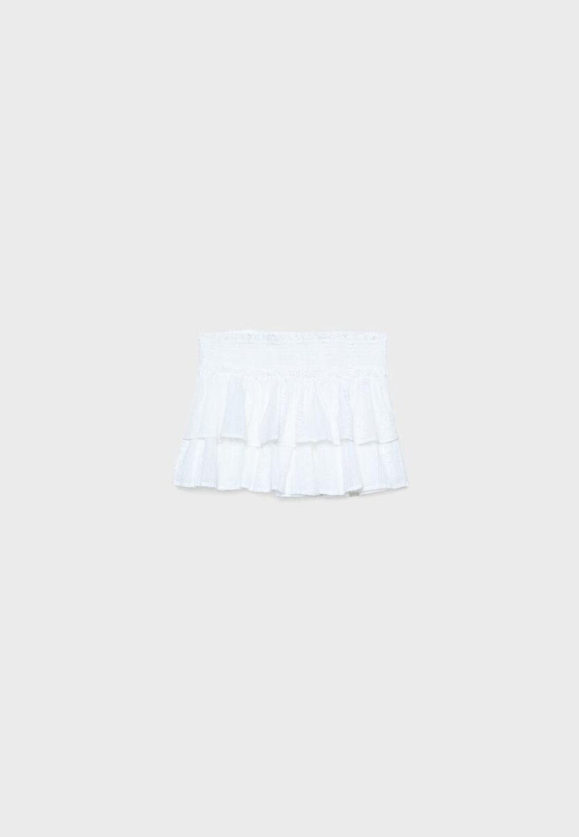 Flytende Skort med middels høy midje og elastisk smocket linning. Matchende broderte detaljer. Flytende kant med volanger. Tilgjengelig i ulike farger.